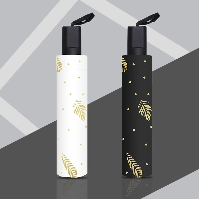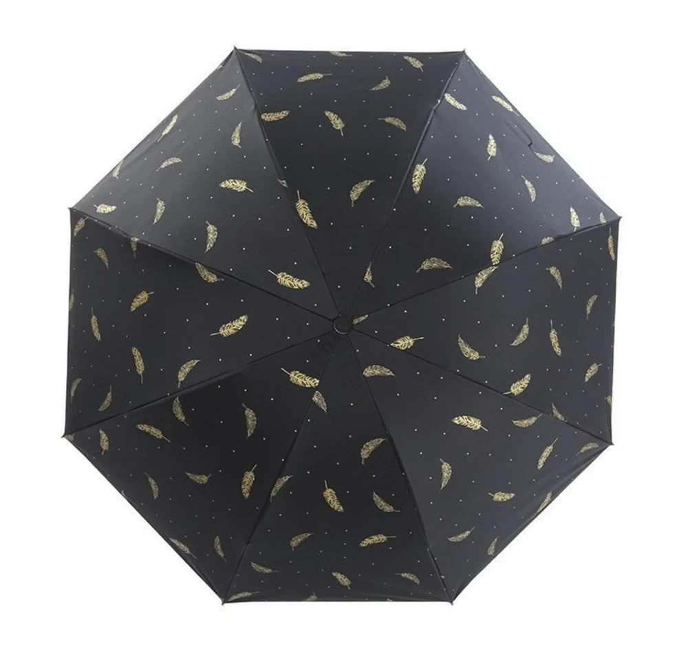(Paragua que cuenta con dos opciones y un hermoso diseño de hojas doradas. Cuando lo cierras se convierte en un tamaño pequeño y es ideal para llevarlo en tu cartera, mochila,etc, impidiendo que te agarre la lluvia).