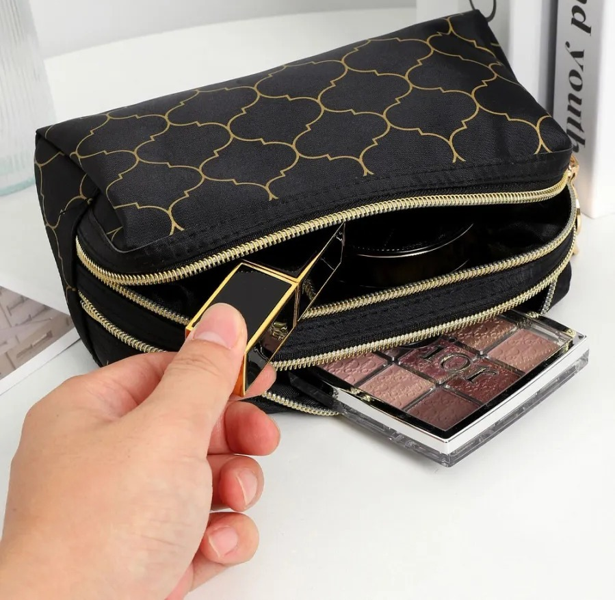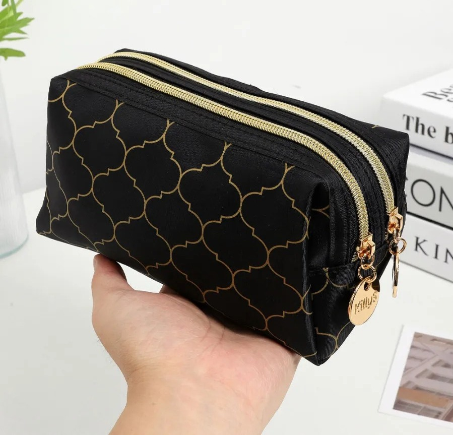 Neceser de Viaje Negro con Estampado Dorado. Chic, funcional y listo para acompañarte a todos lados