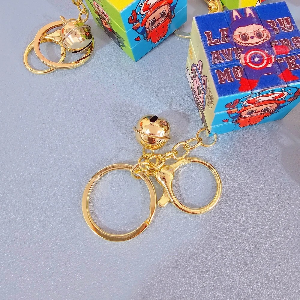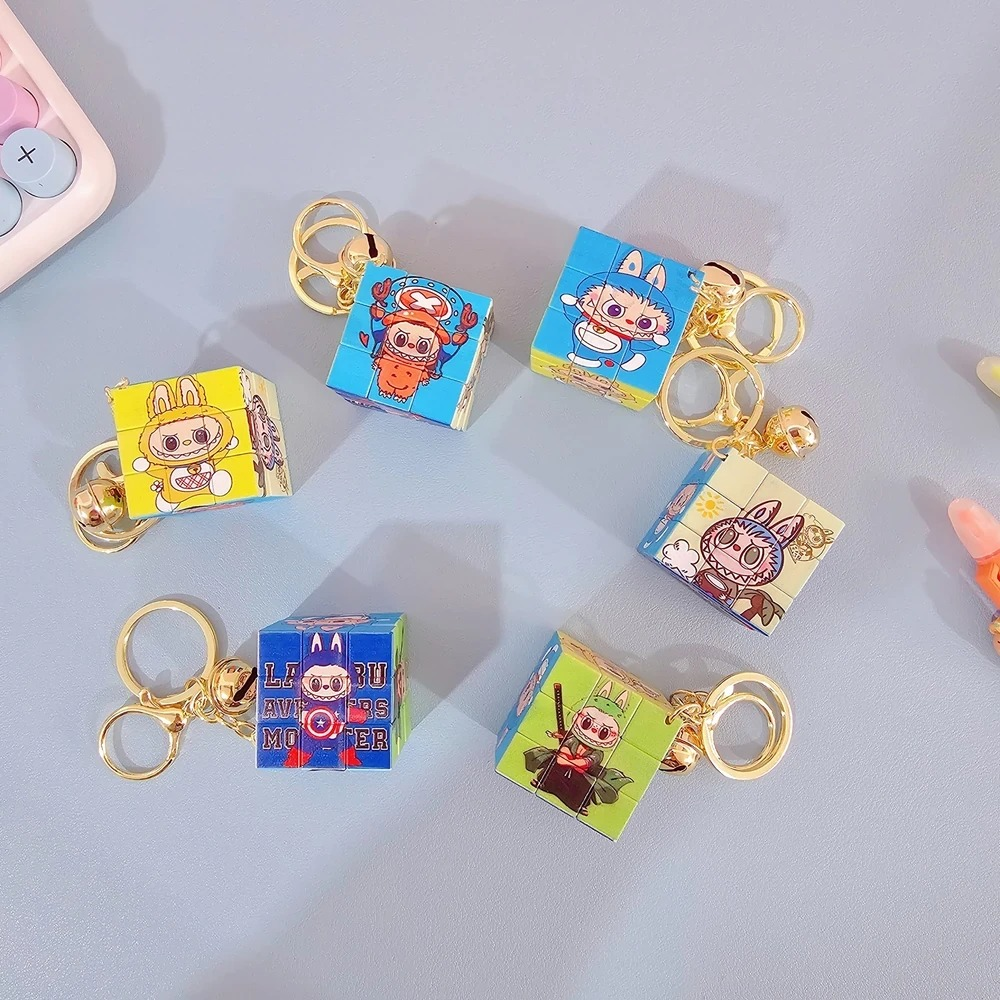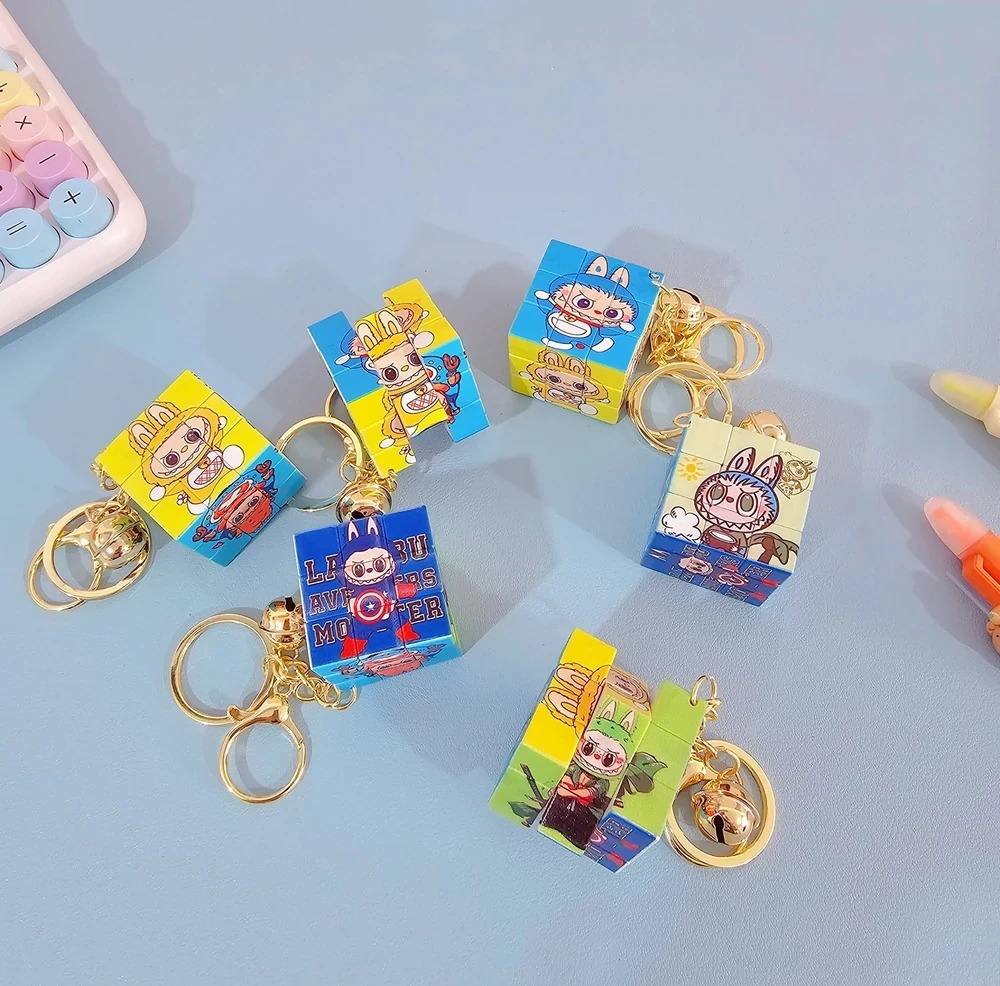 (Llavero en forma de cubo "labubu" en el cual cada cara representa un personaje diferente. Además de un llavero puede servir para un entretenimiento. Trae su aro metálico dorado para poder colocarlo en tus llaves).