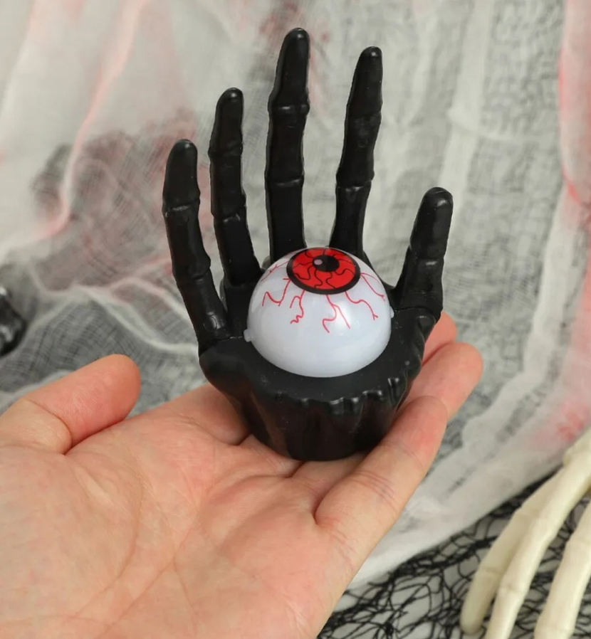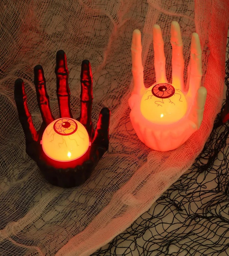 Vela LED Mano Esquelética con Ojo de luz Roja Original decoración de Halloween con forma de mano esquelética sosteniendo un ojo. Emite luz LED roja para un efecto más aterrador. Disponible en color negro o hueso. Funciona con 3 pilas (incluidas). Fabricada en plástico resistente, ideal para ambientaciones temáticas.