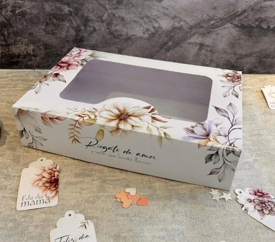 FELIZ DIA MAMÁ Medida: 31X20X7CM mumm diseño "Florece" Ideal para picadas, petit four, degustacion etc El packaging perfecto para agregarle valor a tu presentación del dia de la madre
