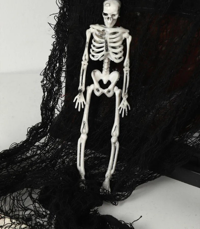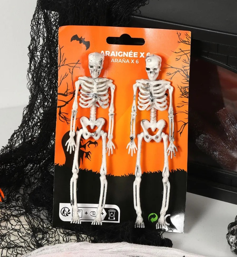Pack de 2 esqueletos articulados de plástico en color blanco con detalles oscuros. Son livianos y fáciles de colocar como decoración de Halloween, ideales para colgar, ambientar mesas, rincones o armar escenas terroríficas. Presentación en blister.