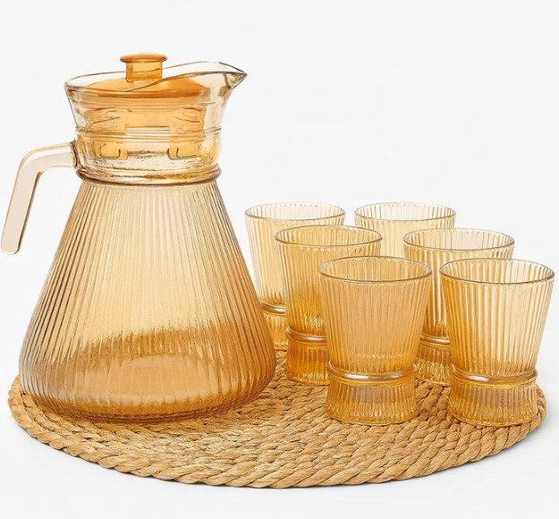 Hermoso set de 1 JARRA con 6 vasos, ideal para servir vino, limonadas o lo que quieras. Estilo para tu mesa