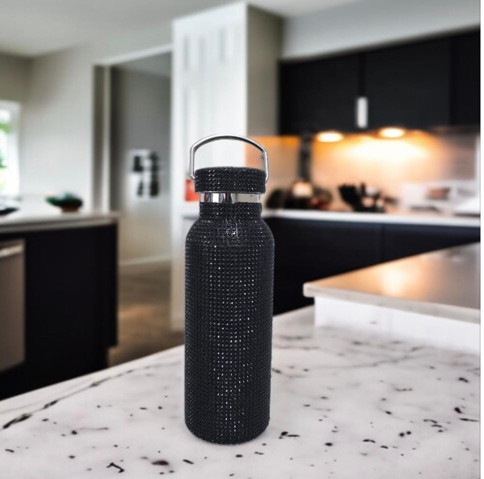 Botella de acero inoxidable 500cc, cubierta de strass y tapa hermética. Altura: 22 cm. Incluye manija y presentación en cajita individual.