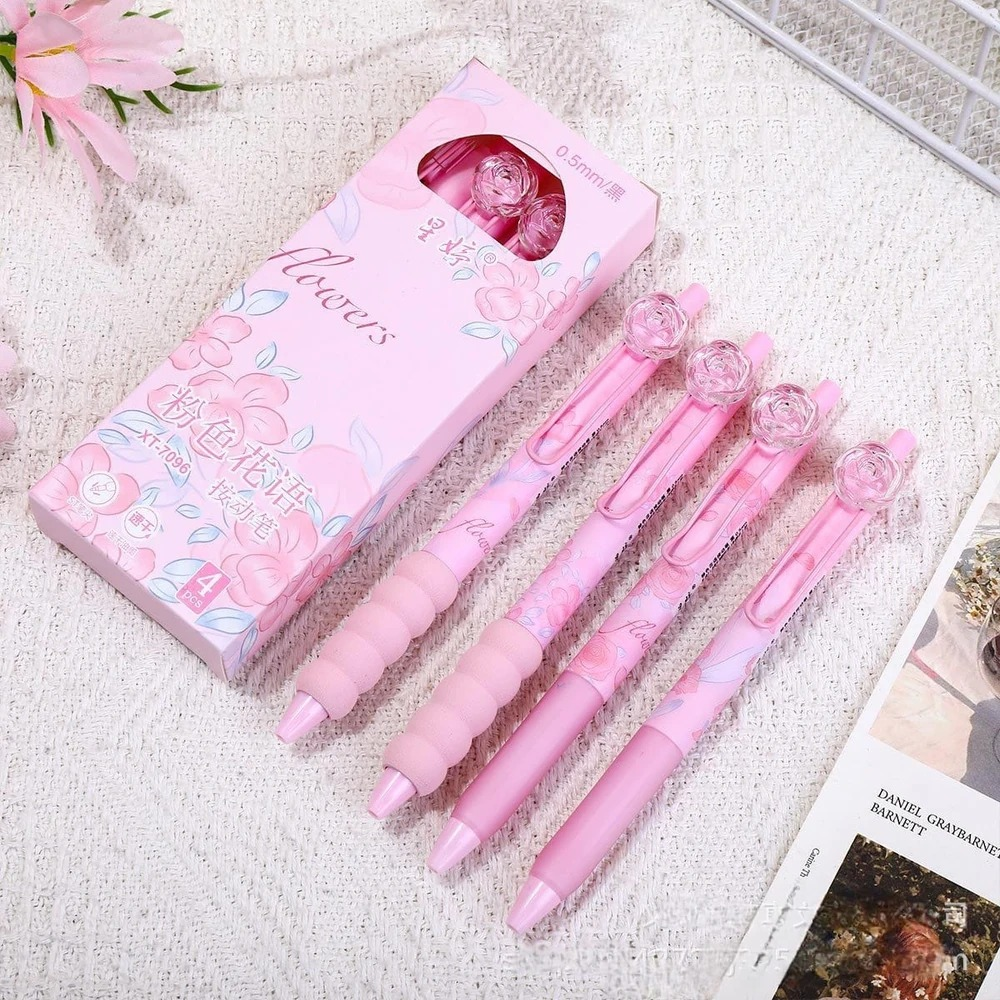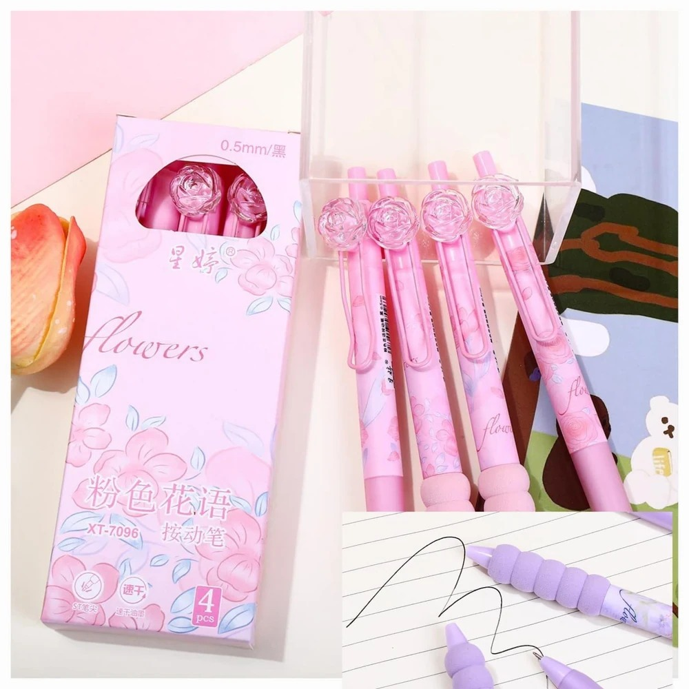 (Set de 4 bolígrafos de gel retráctiles, lo que significa que la punta se extiende y retrae con un mecanismo de clic. La tinta es de color negro y el grosor de la punta es de 0.5mm. Son de secado rápido, lo cual es una ventaja para evitar manchas al escribir. Sirven para escribir, tomar notas, dibujar o cualquier otra actividad que requiera el uso de un instrumento de escritura, ofreciendo una experiencia de escritura suave y un diseño estético).