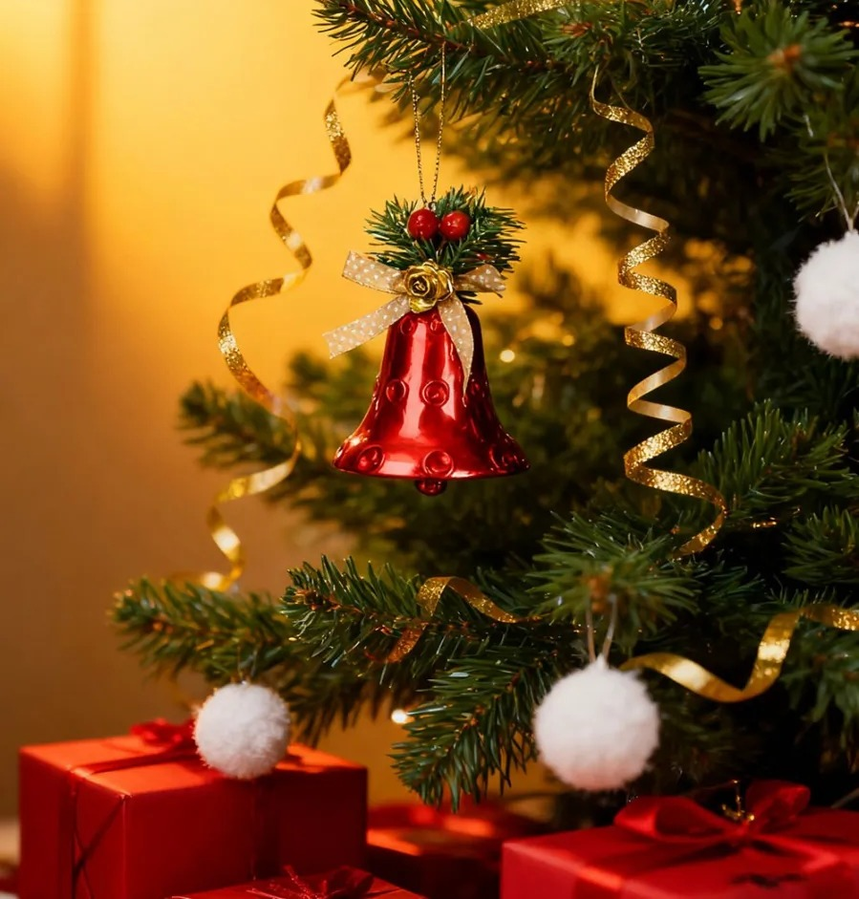 Set de 6 adorno decorativos navideños. Dale brillo y elegancia a tu árbol con este set de 6 esferas o campanas navideñas rojas, decoradas con lazos, ramitas verdes y un detalle dorado.