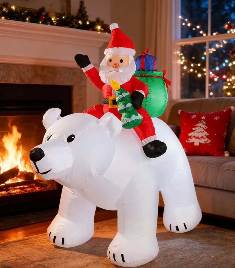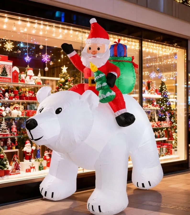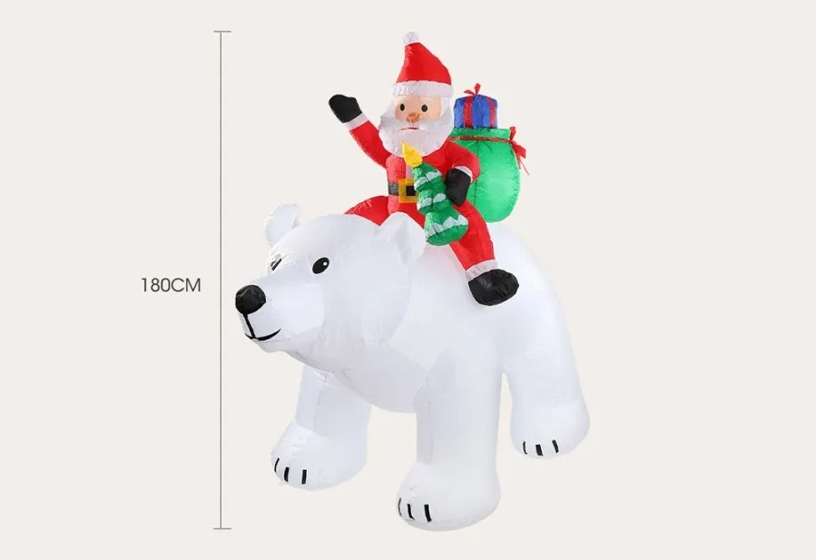 Inflable Navideño Papá Noel en Oso Pola. Sorprendé a todos con esta original decoración navideña: un Papá Noel inflable de 1,8 metros montado sobre un oso polar. Con colores vibrantes, saco rojo, gorro clásico y una gran bolsa de regalos, este adorno es ideal para crear un ambiente festivo único en tu hogar, jardín o vidriera. Fabricado en poliéster de alta calidad, es resistente y fácil de instalar gracias a su sistema de inflado rápido y conexión eléctrica. Su tamaño y diseño llamativo lo convierten en el centro de todas las miradas.