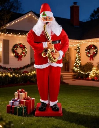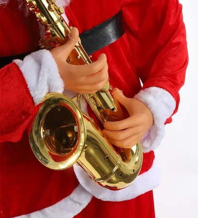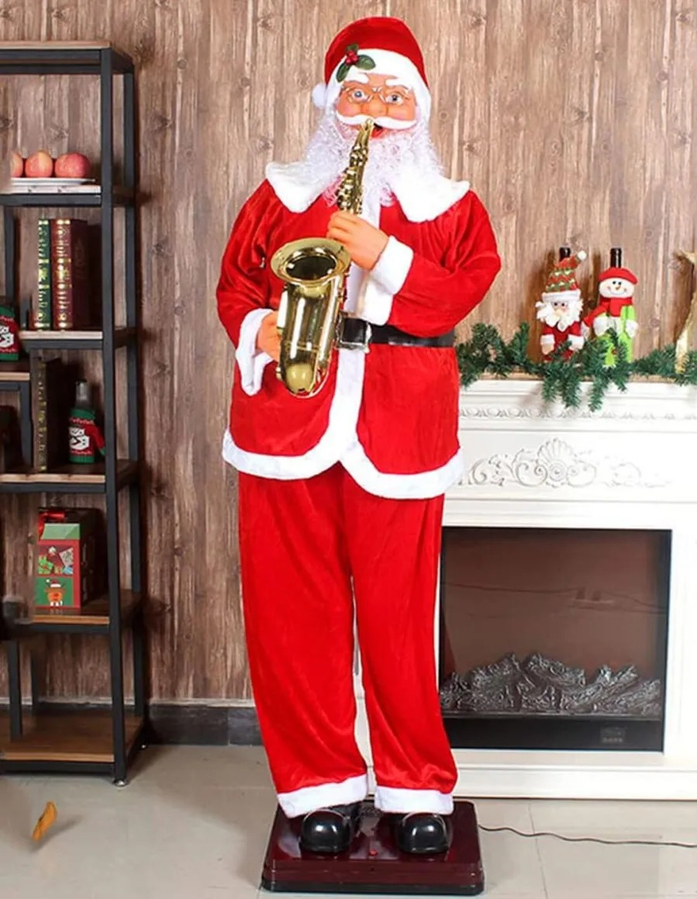 Papá Noel Musical con Saxofón Sorprende a todos esta Navidad con este increíble Papá Noel eléctrico de 1,8 metros de altura. Con su llamativo traje rojo, barba blanca y un saxofón dorado, este adorno no solo decora, ¡sino que también se mueve y toca música navideña! Fabricado con estructura de plástico resistente, es ideal para decorar vidrieras, locales, eventos o el hogar, creando un ambiente festivo único y alegre.
