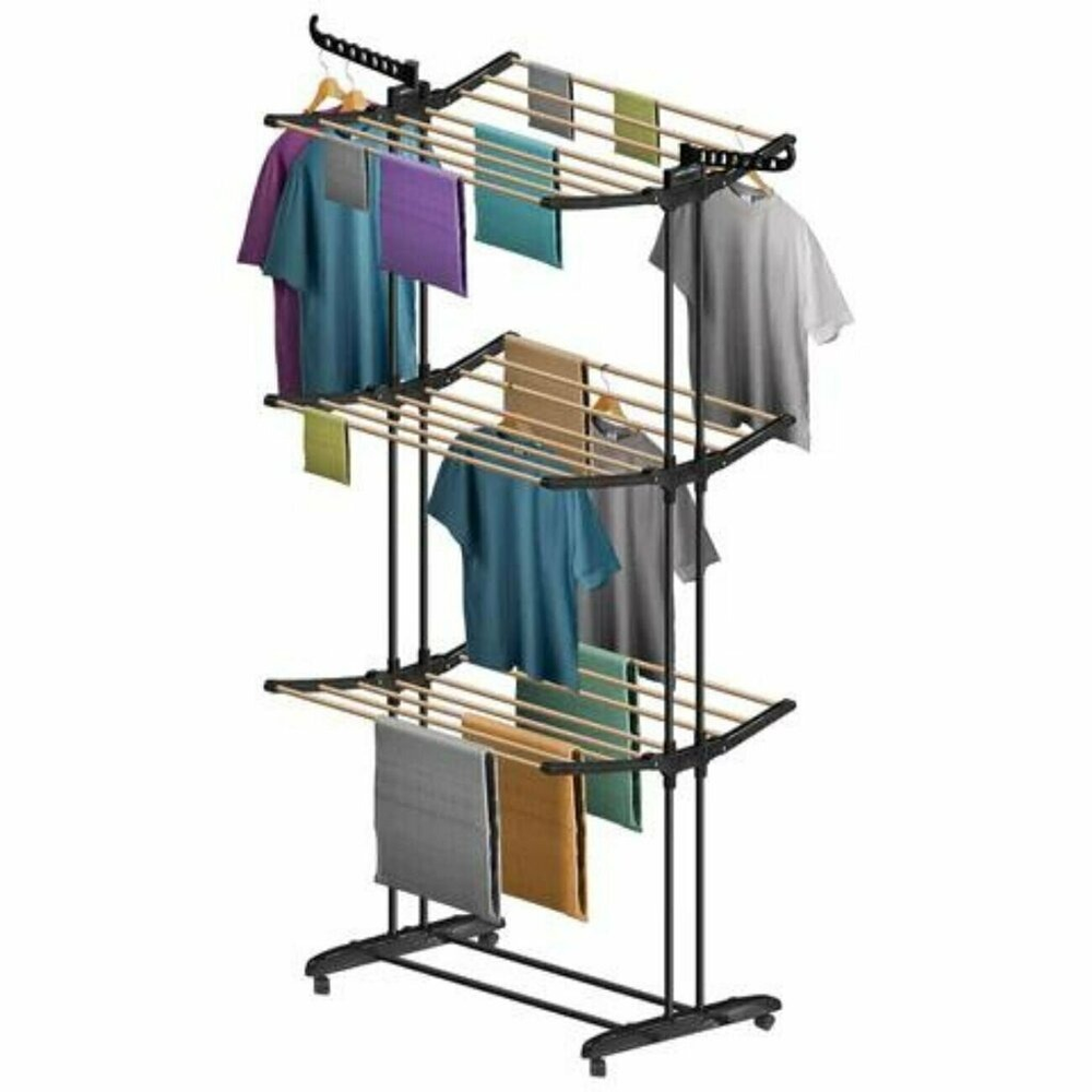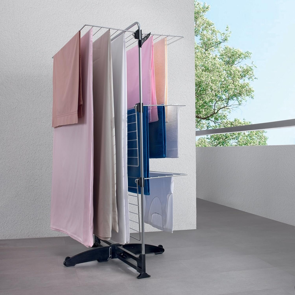 Tender 3 pisos negro Este es un tendedero de ropa plegable y vertical, ideal para secar prendas en espacios reducidos. Cuenta con múltiples niveles (generalmente 3 o 4) y alas laterales para maximizar la capacidad de secado. Su diseño plegable permite ahorrar espacio cua