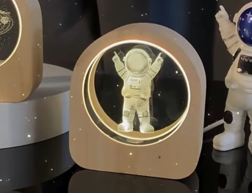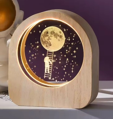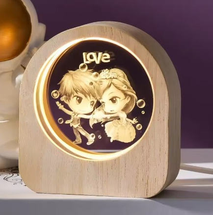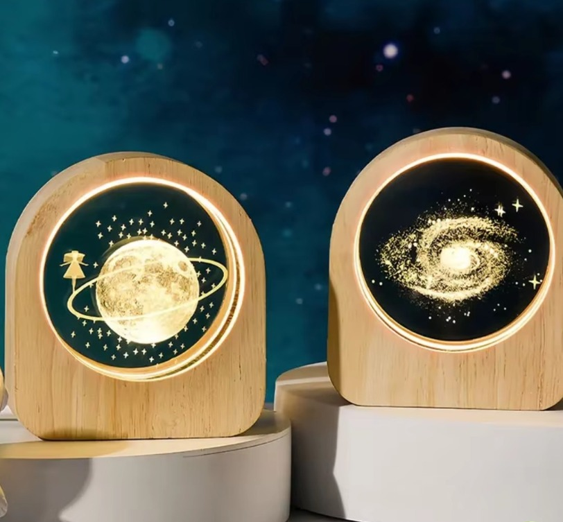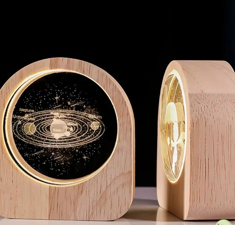 🔹 Base de madera natural, cálida y elegante. 🔹 Cristal extraible 🔹 Luz LED suave y envolvente. 🔹 Conexión USB para mayor comodidad. 🔹 Tamaño aproximado: 7,5 cm x 7,5 cm.