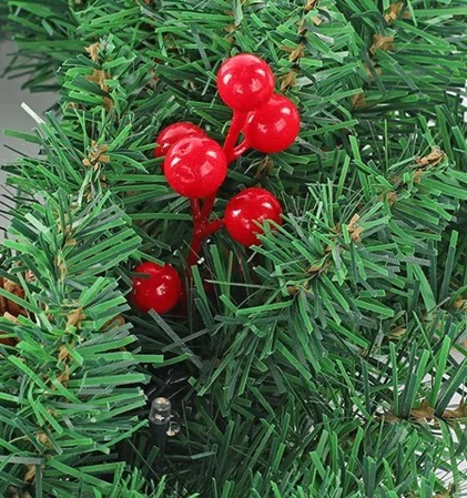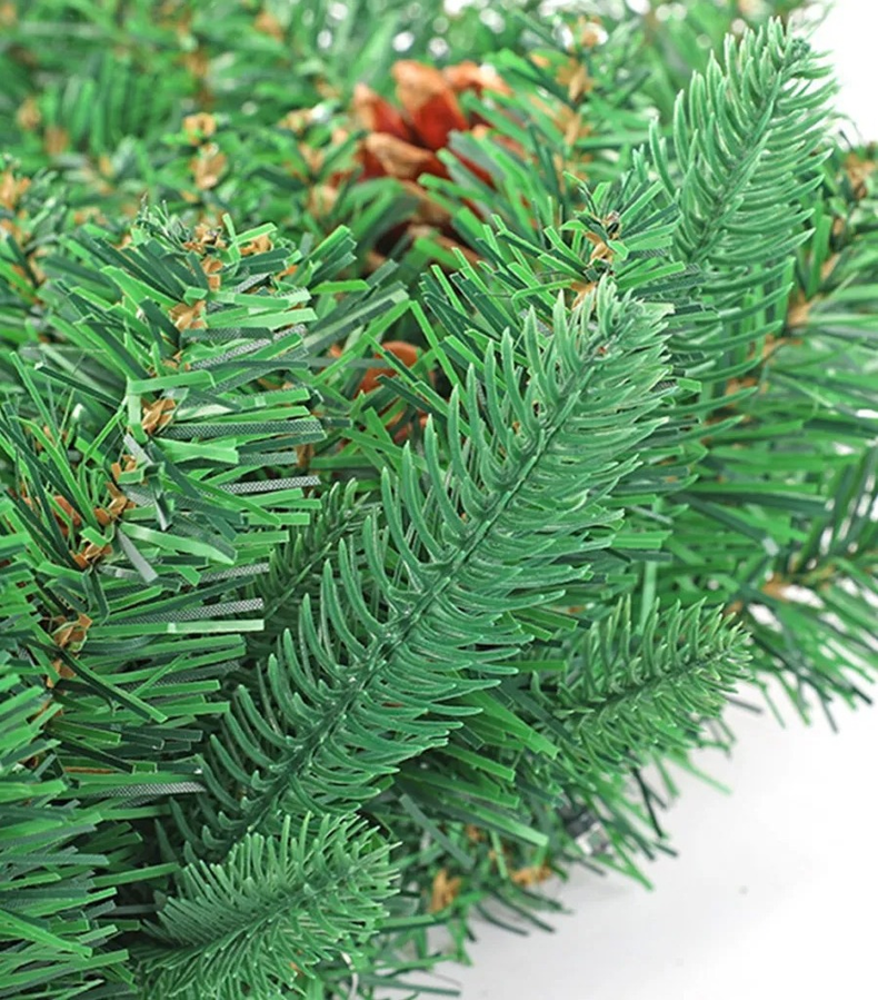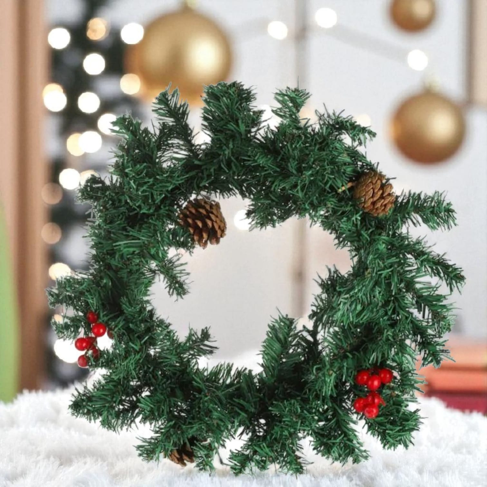 Corona navideña decorativa. Incluye luces incorporadas que realzan su diseño, adornada con piñas y frutos rojos para un estilo clásico y festivo. Funciona con 2 pilas AA (no incluidas). Perfecta para colgar en puertas, ventanas o paredes y darle a tu hogar un cálido espíritu navideño.