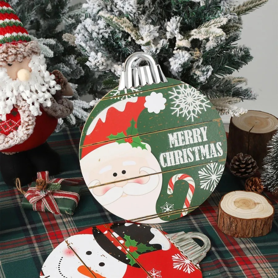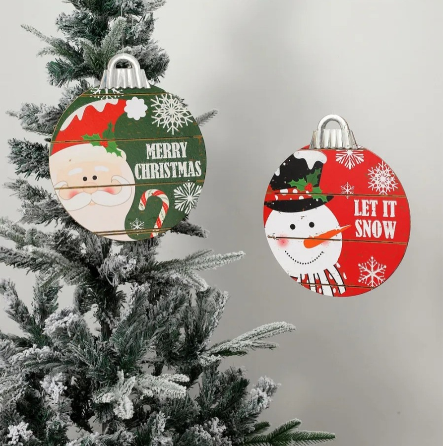 Decoración navideña colgante de madera, con diseño redondo estilo adorno de árbol. Incluye dos modelos: uno con motivo de Papá Noel y mensaje “Merry Christmas” y otro con muñeco de nieve y frase. Perfectos para colgar en la pared, puerta o árbol de Navidad, aportando un toque cálido y festivo a la decoración del hogar. MEDIDAS APROXIMADAS: 30.5 x 26 CM.