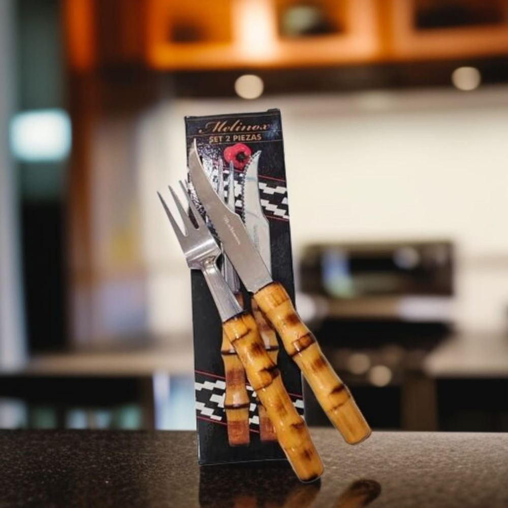 SET ASADOR X 2 TENEDOR Y CUCHILLO MANGO CAÑA BAMBOO