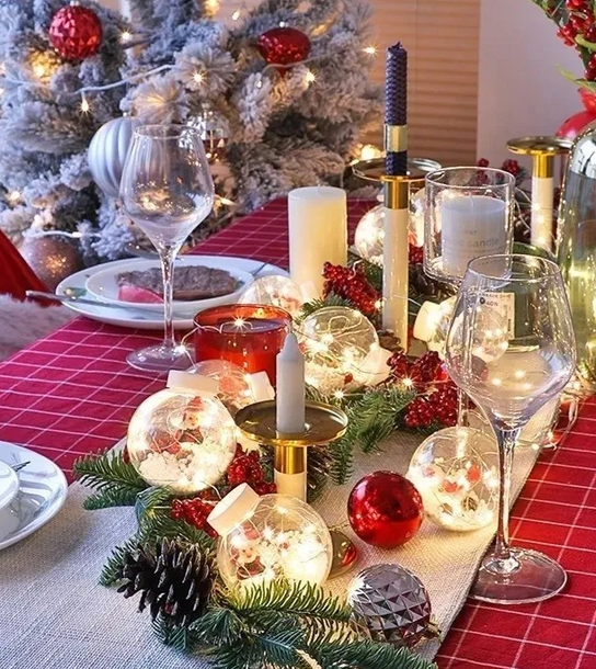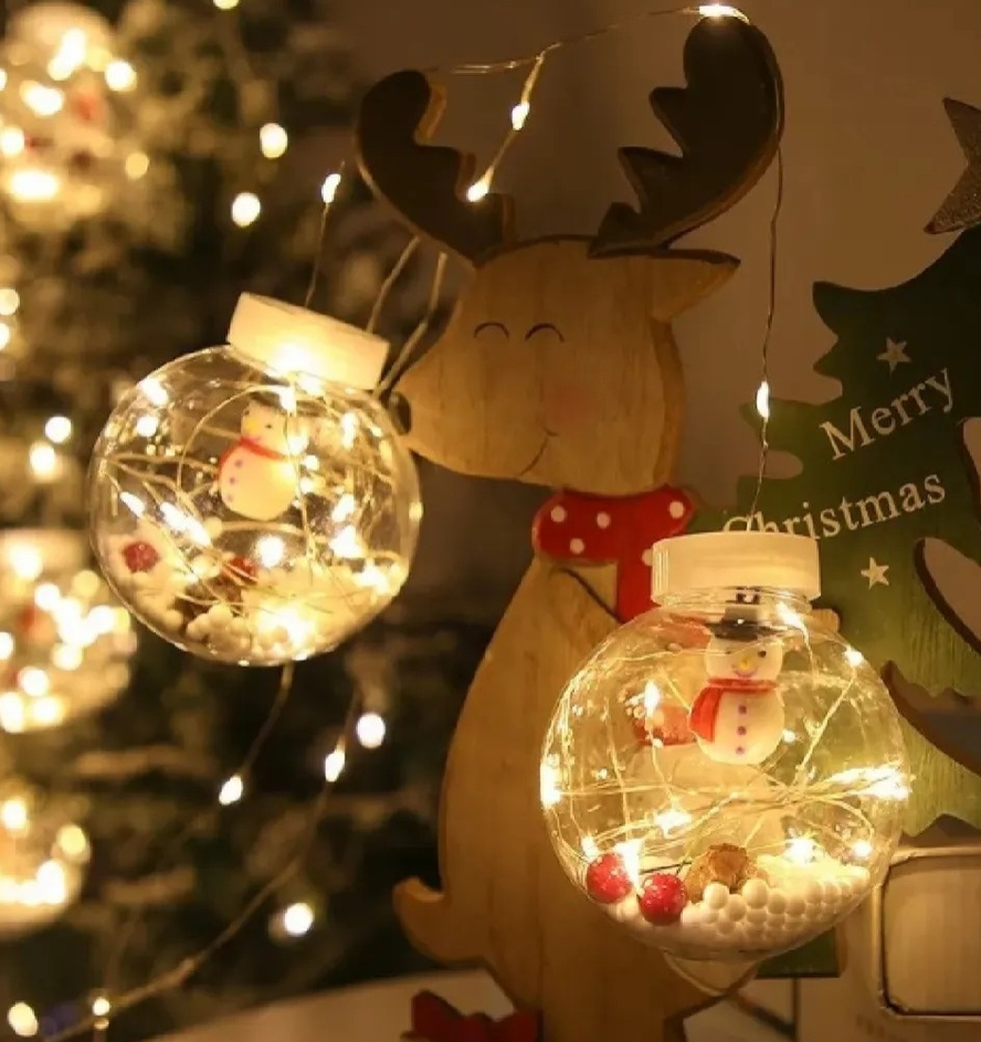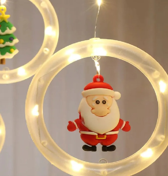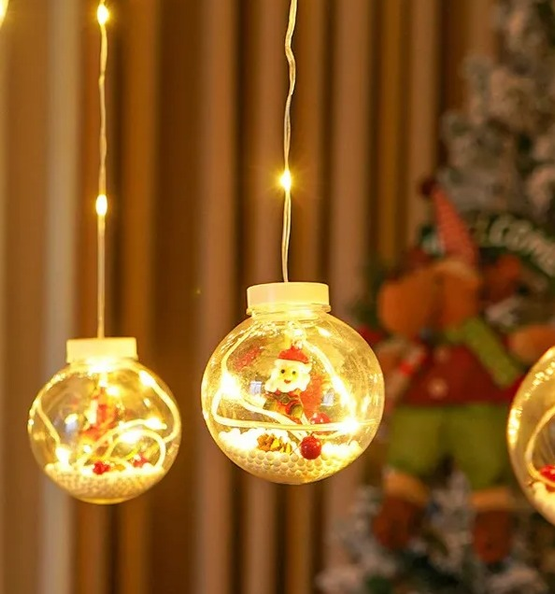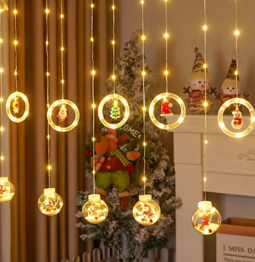 GUIRNALDA LED CON DISEÑO NAVIDEÑO. CUENTA 110 LUCES, 5 ESFERAS CON ADORNO Y 5 AROS CON ADORNOS. MEDIDAS APROXIMADAS: 3 M