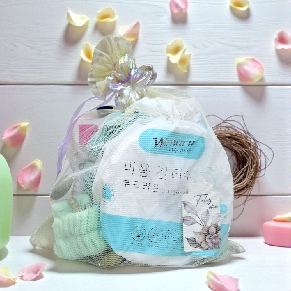 EL KIT CONTIENE 1 RODILLO JADE SIN PACKAGING 1 TAG MAMA 1 BOLSA ORGANZA 1 SET VINCHA+ MUÑEQUERAS SKINCARE 1 BROCHE FLOR TORNASOLADO 1 AGUA MICELAR 200ML ALGABO 1 ROLLO TOALLITAS DESMAQUILLANTE