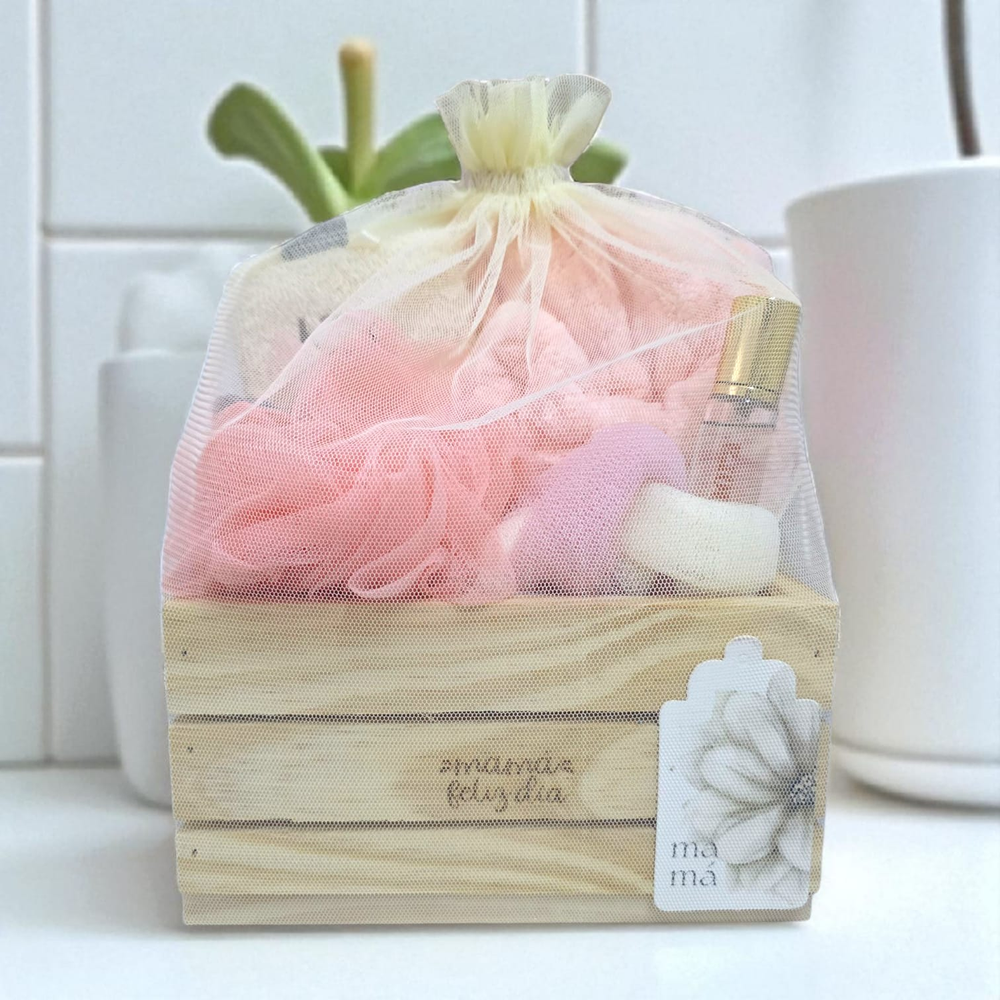 EL KIT CONTIENE 1 CANASTO MADERA FELIZ DIA MAMA 1 TAG MAMA 1 BOLSA ORGANZA 1 SET 3 ESPONJAS BAÑO SPA 1 COLONIA AQUI Y AHORA 1 GORRA COFIA DE BAÑO
