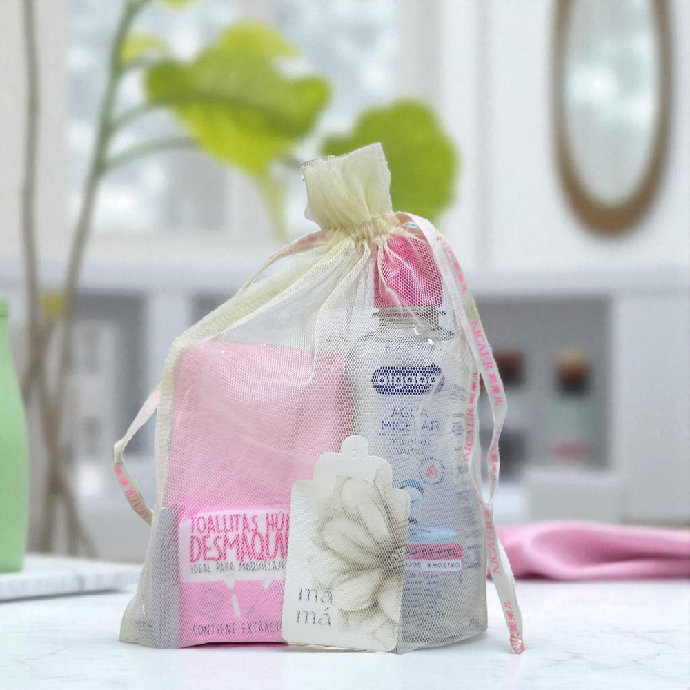 1 TAG MAMA 1 BOLSA ORGANZA 1 VINCHA SKINCARE 1 AGUA MICELAR 200ML ALGABO 1 TOALLITA DESMAQUILLANTE OLIVA Y ALOE
