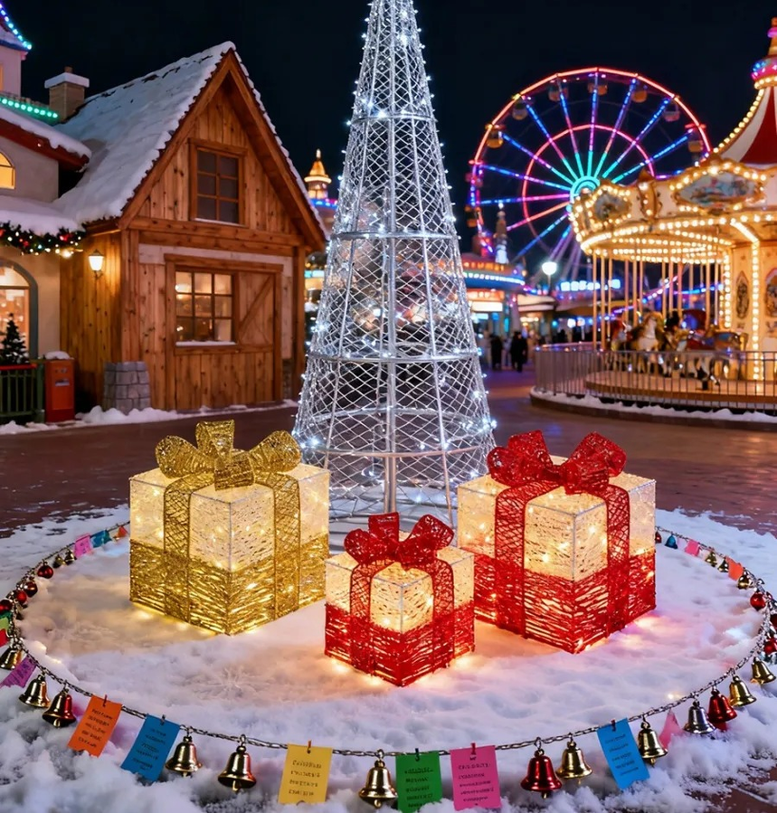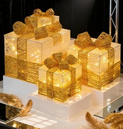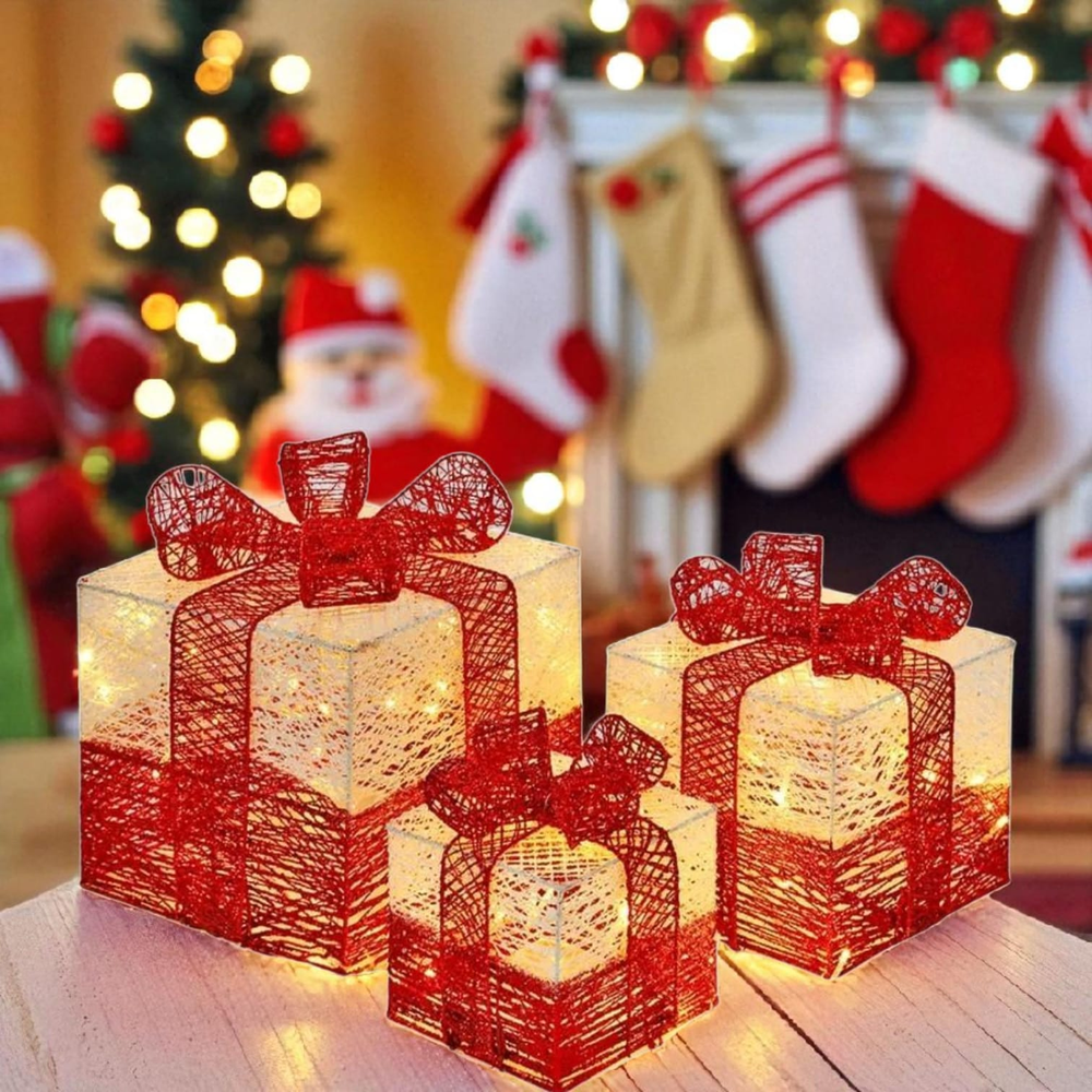 Iluminá tus fiestas con este hermoso set de 3 cajas de regalo decorativas con luces LED integradas, ideales para completar la decoración navideña de tu hogar, vidriera o evento. Cada caja está fabricada con estructura metálica tejida, con detalles brillantes en tonos rojo y dorado, y un gran lazo que resalta su diseño elegante y festivo. Cuenta con 100 luces LED cálidas. (monocolor)