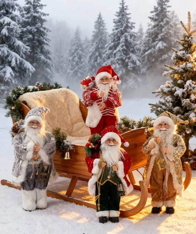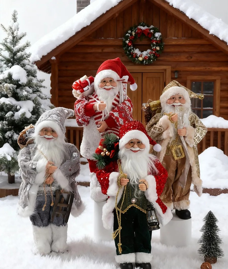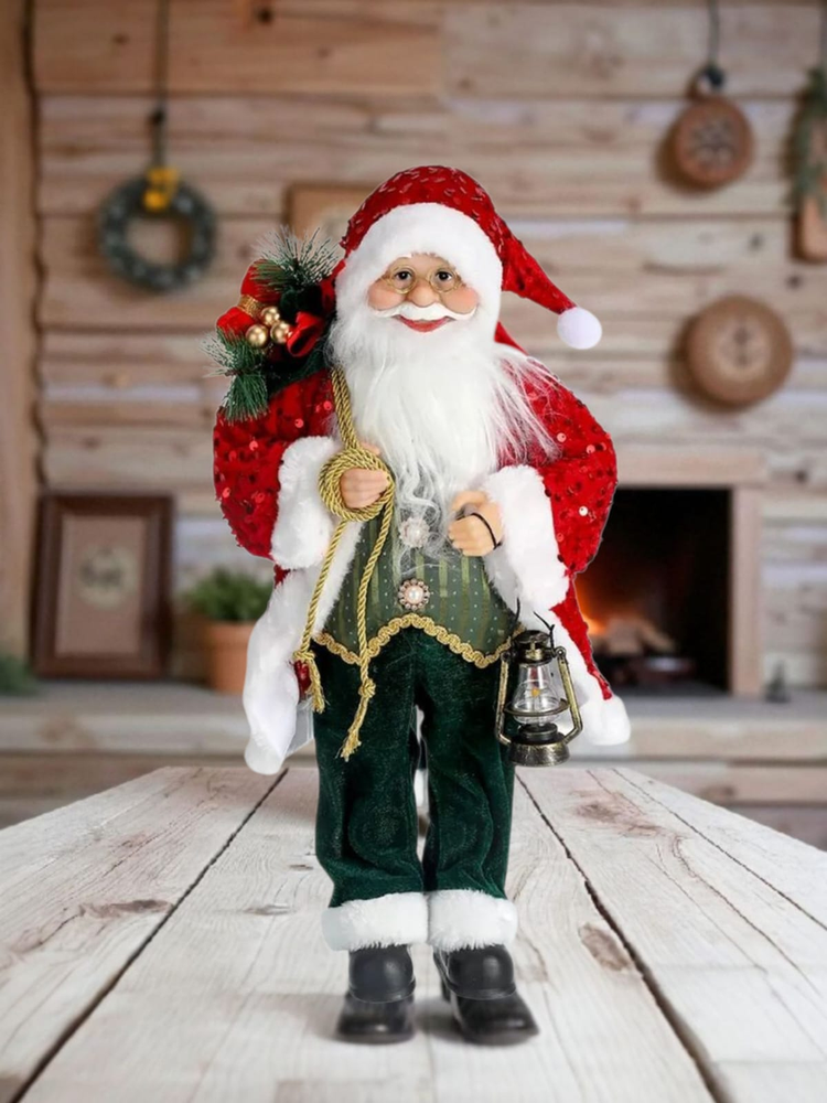 Adorno de papa noel Decorativo. Llena tu hogar de magia navideña con este imponente papa noel decorativo. Su rostro detallado, barba blanca y gafas le dan un aspecto realista y encantador, mientras que su vestimenta de tela con adornos brillantes aporta un toque de elegancia y tradición a tus espacios. Cada modelo viene acompañado de accesorios navideños, como sacos de regalos, ramas decoradas o faroles, lo que lo convierte en la pieza ideal para destacar en la entrada, junto al árbol o como protagonista en tus decoraciones de interior.