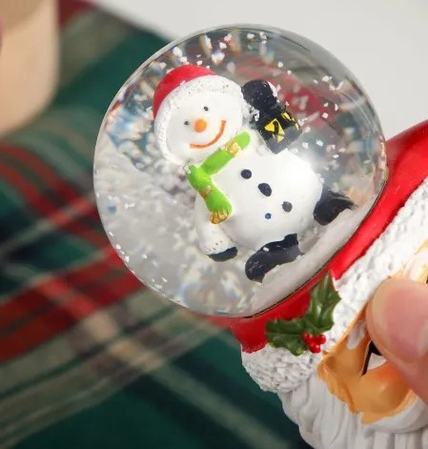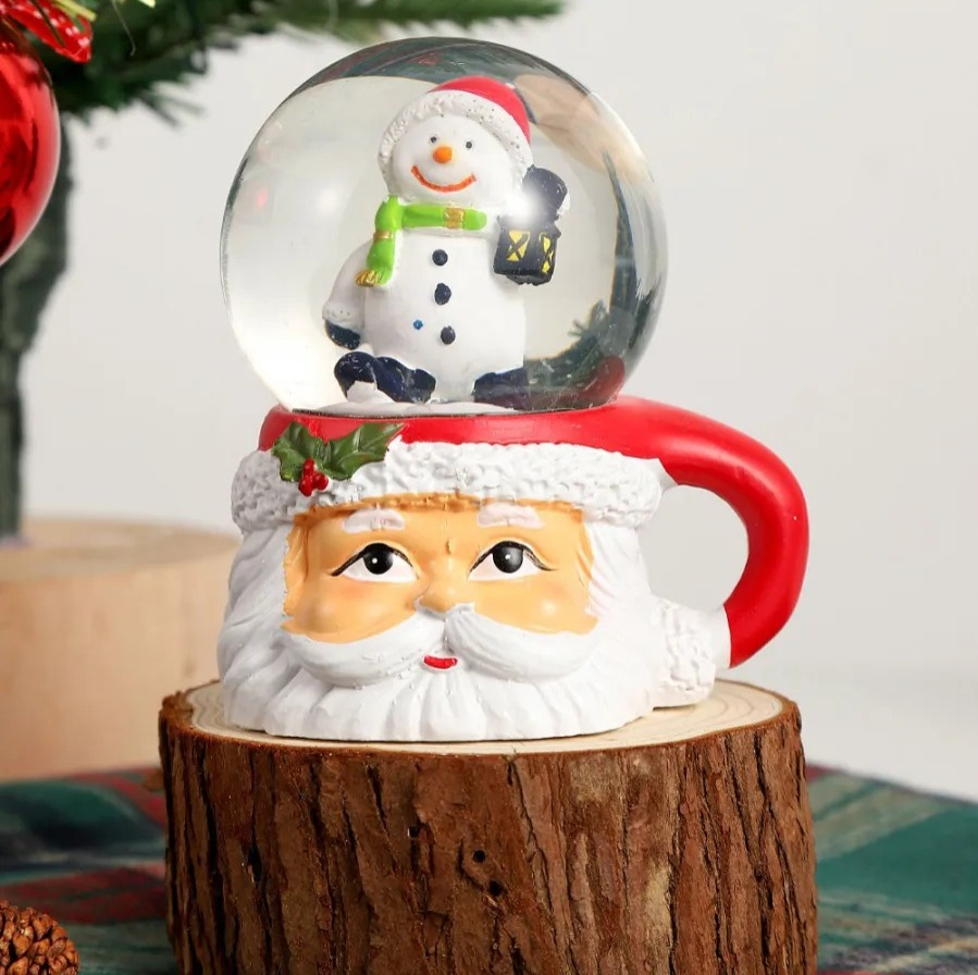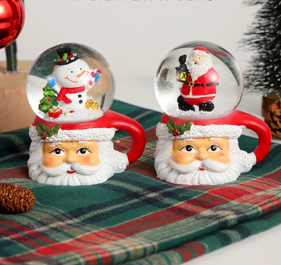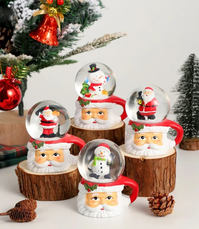 Bola de cristal navideñas. Originales bolas de nieve decorativas con base en forma de taza de Papá Noel. Cada esfera contiene una figura navideña en miniatura (Papá Noel o muñeco de nieve), que al agitarse crea un efecto mágico con copos brillantes. Fabricadas en resina y vidrio, combinan color, brillo y ternura, siendo el detalle perfecto para decorar mesas, repisas, escritorios o regalar en las fiestas.
