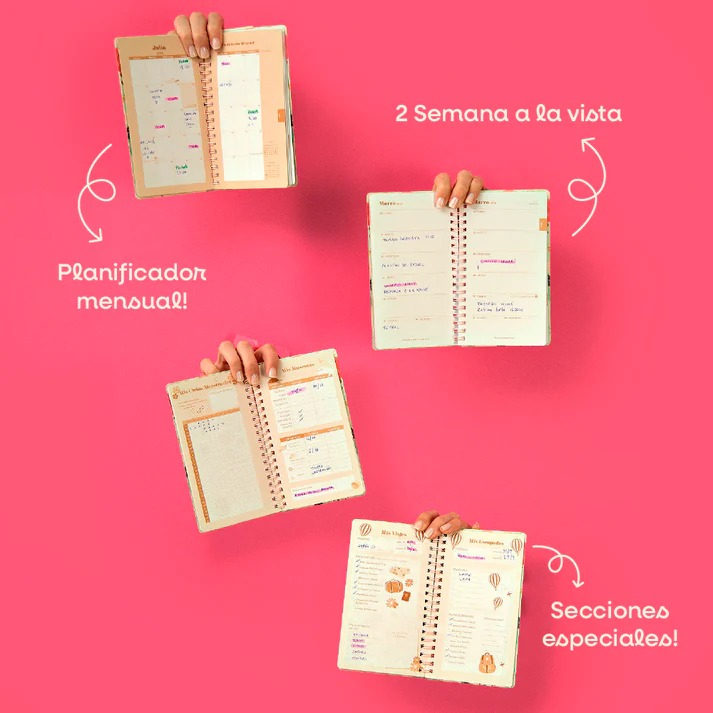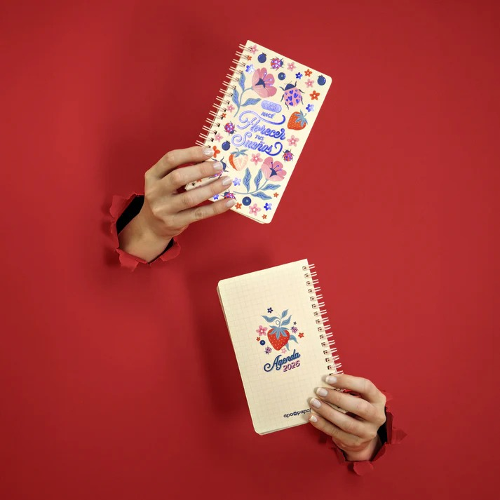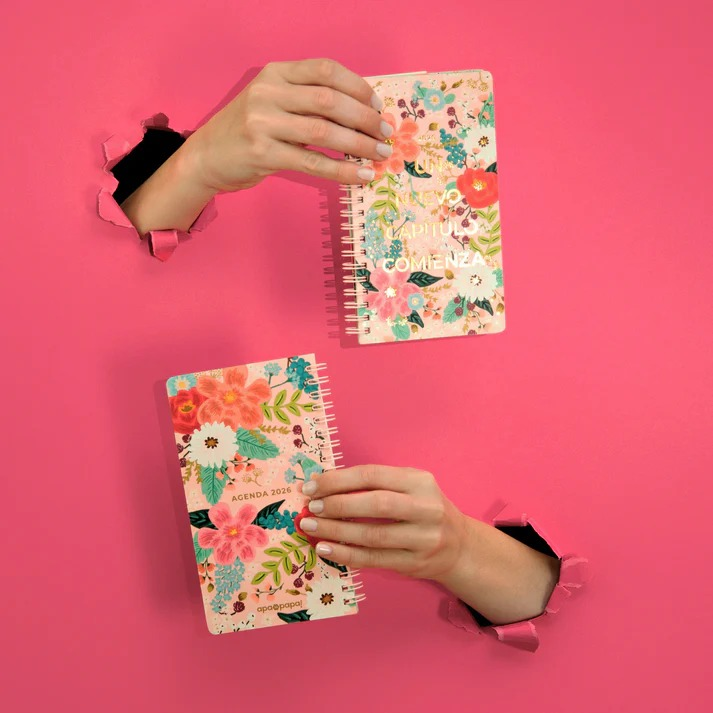 Compacta, versátil, económica. Formato: Pocket (10 x 17 cm.) – 2 Semanas a la vista. Tapa semi rígida, con terminación en papel texturado mate. Con hot stamping, elástico y anillado a tono de cada diseño.