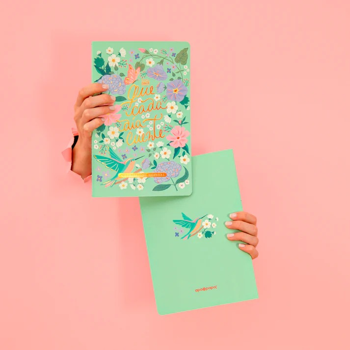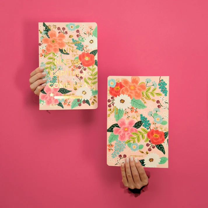 Medidas: 17 x 25 cm. Tapa semi rígida, puntas redondeadas, terminación con papel texturado mate encuadernación cosida, con hot stamping metalizado.