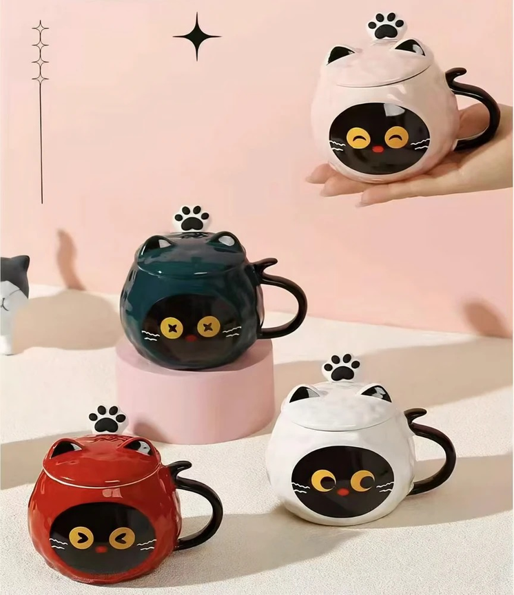 TAZA CERAMICA GATO CON COLA+ TAPA + CUCHARA