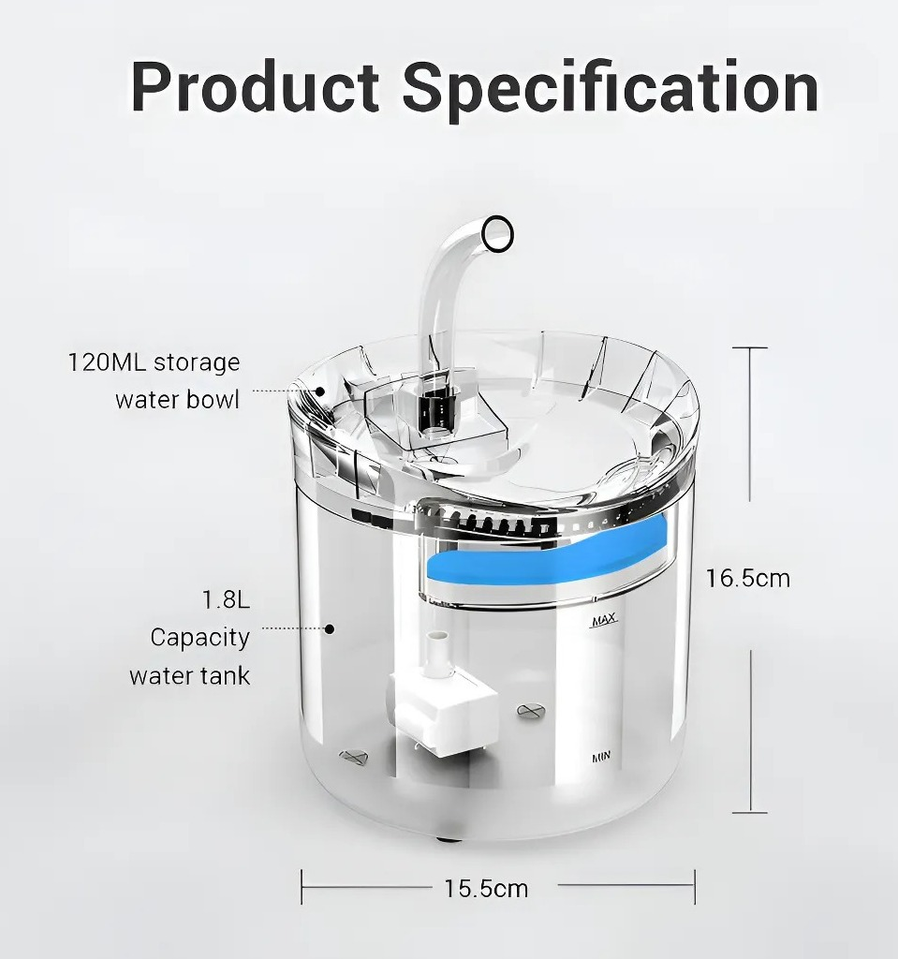 Gran capacidad de agua de 1,8 L, adecuada para diferentes edades de gatos, perros y múltiples hogares de mascotas. El agua de almacenamiento puede durar una semana, permitiendo salir durante unos días sin preocuparte por tus mascotas.