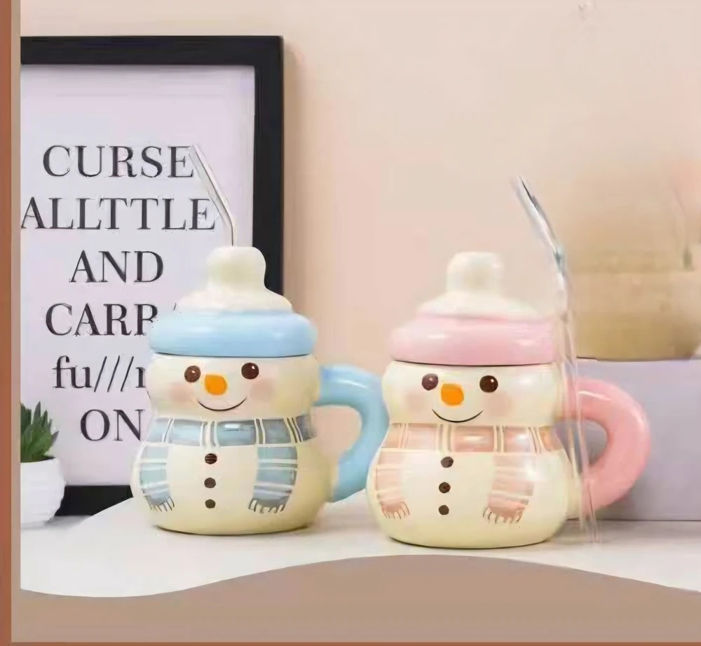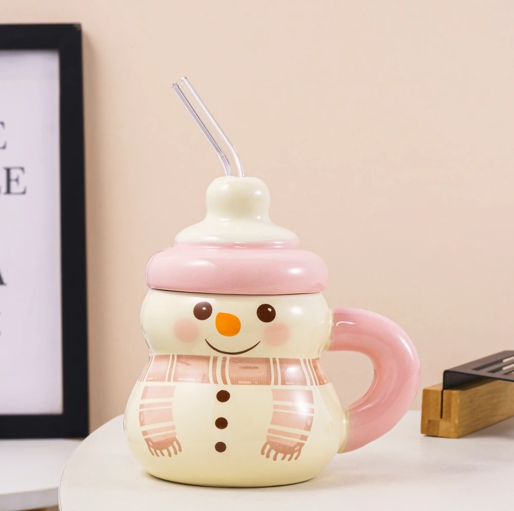 TAZA CERAMICA MUÑECO DE NIEVE CON TAPA + SORBETE