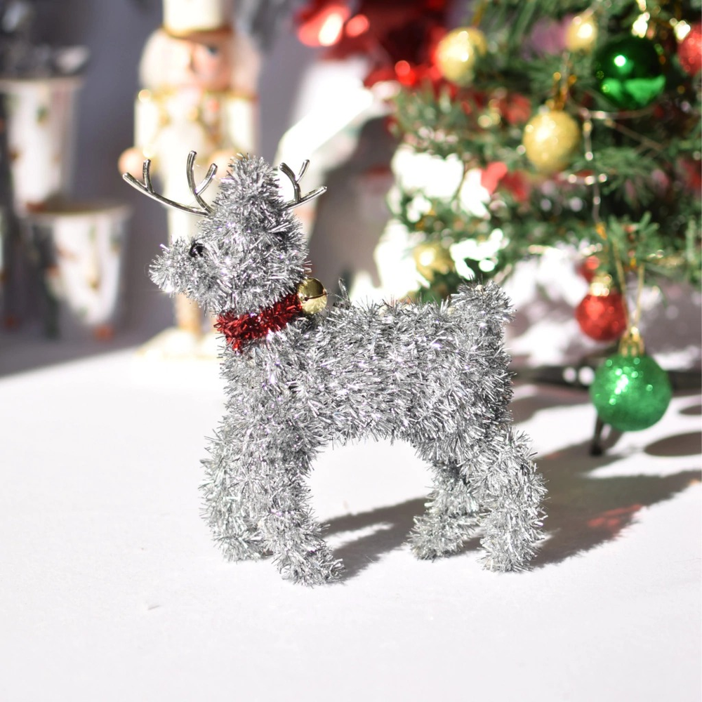 Adorno colgante de oropel con estructura plástica en forma de reno. Ideal para negocios, vidrieras y locales comerciales que buscan destacar su decoración navideña y atraer clientes. Aporta brillo y elegancia, generando un ambiente festivo y profesional. Material: estructura plástica recubierta de oropel plateado. Fácil de instalar y reutilizable. Optimice la presentación de su comercio y aumente el atractivo visual durante las fiestas.