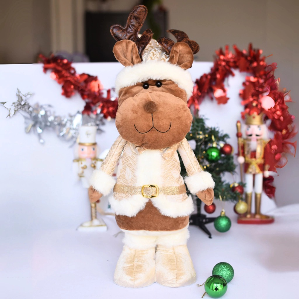 Incorporá a tu vidriera o local el Reno de Navidad de felpa "Golden" de 55cm, ideal para destacar tu propuesta navideña. Se sostiene de pie, captando todas las miradas con su ropa y detalles en chiffon oro y gorro con cascabel. Perfecto para generar un ambiente cálido y atractivo, potenciando la decoración comercial y atrayendo clientes con estilo y calidad.