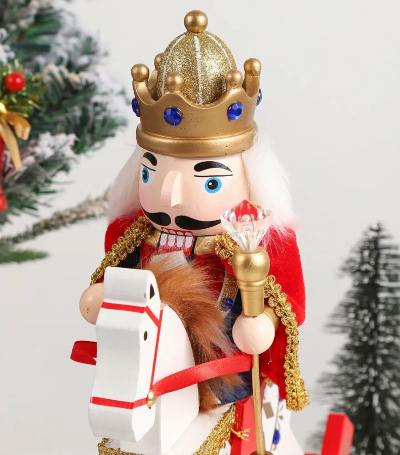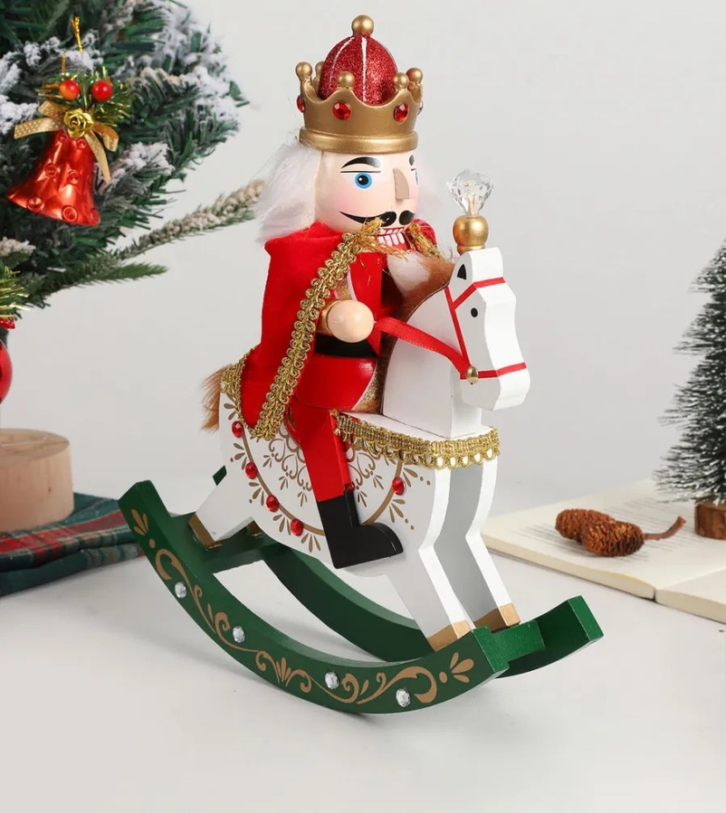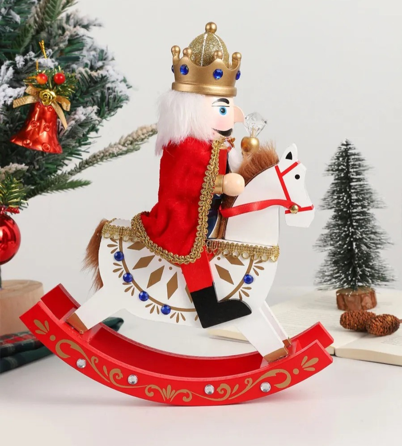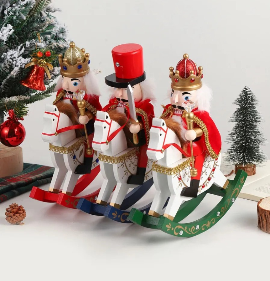 Decoración Navideña . Soldadito Cascanueces en Caballito Balancín Elegantes figuras navideñas con diseño de cascanueces, montados en caballitos balancines pintados a mano con detalles dorados y colores festivos. Cada soldadito viste capa roja con bordados y lleva corona o sombrero distintivo, aportando un aire clásico y encantador a la decoración. Ideales para colocar junto al árbol, en repisas o mesas, creando un ambiente cálido y tradicional en tu hogar durante las fiestas.