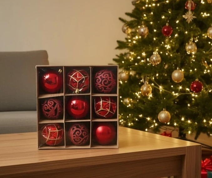 (Cada caja cuenta con 9 esferas navideñas de color matte y brilloso. Ideal para decorar el árbol de navidad, el diámetro de cada esfera es de 8cm).
