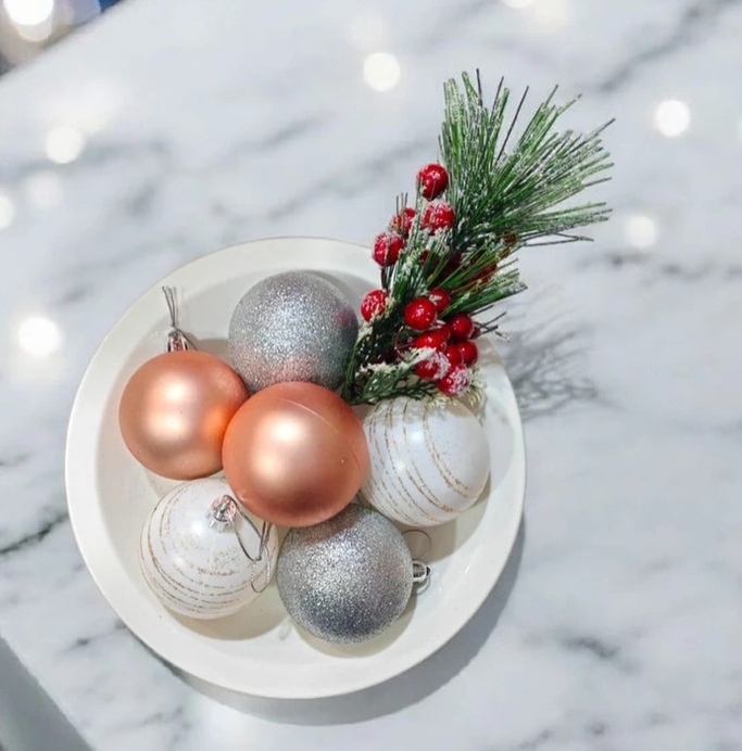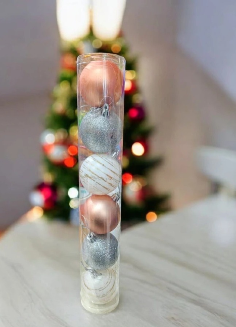 Bolitas Blancas con detalle en glitter dorado, un un rosita y con glitter en plateado. Son medianas tirando a grande. Ideal para un arbol mediano o mismo grande.