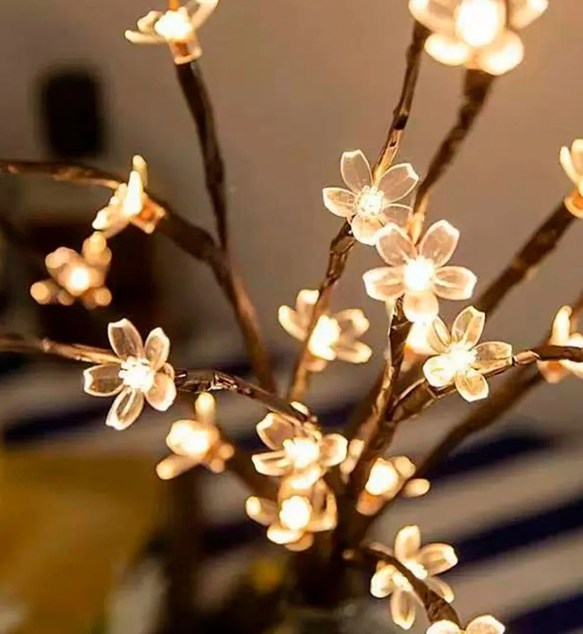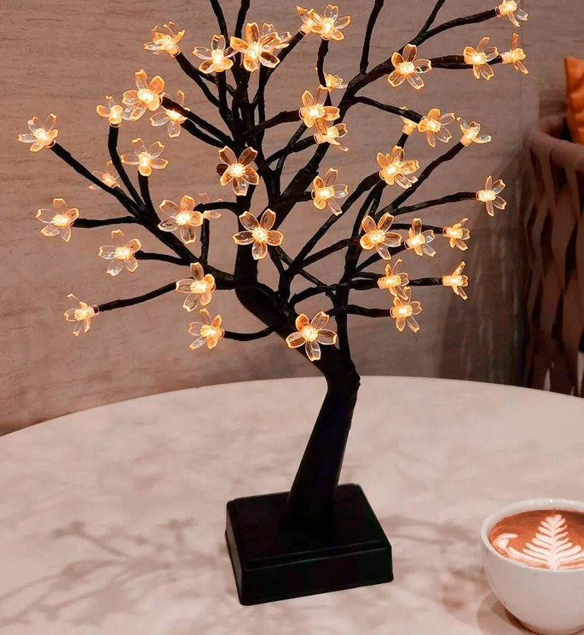 Árbol decorativo de mesa, con 36 luces. Perfecto para agregar un toque cálido y decorativo en escritorios, dormitorios o recepciones. La iluminación LED crea un ambiente acogedor, ideal para uso diario o temporada festiva. Se carga con USB.