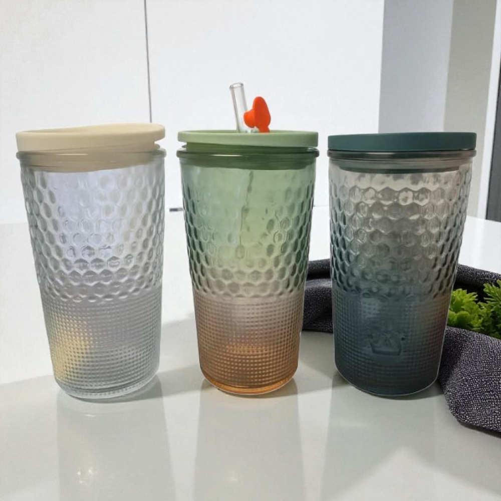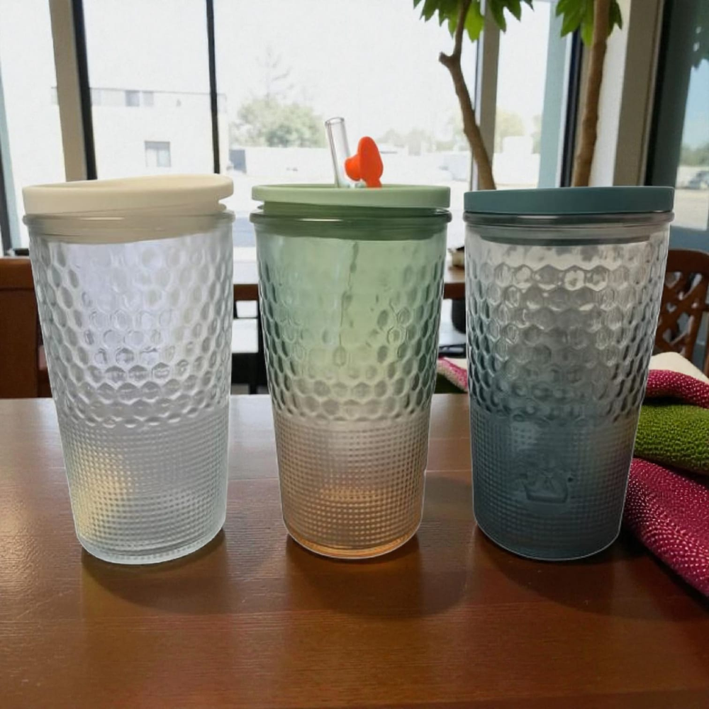 Vaso de vidrio con tapa, con diseño texturizado. Pueden ser utilizados para una variedad de bebidas frías como café helado, agua o batidos. Vienen con tapa y sorbete de vidrio de borosilicato, conocido por su resistencia al choque térmico