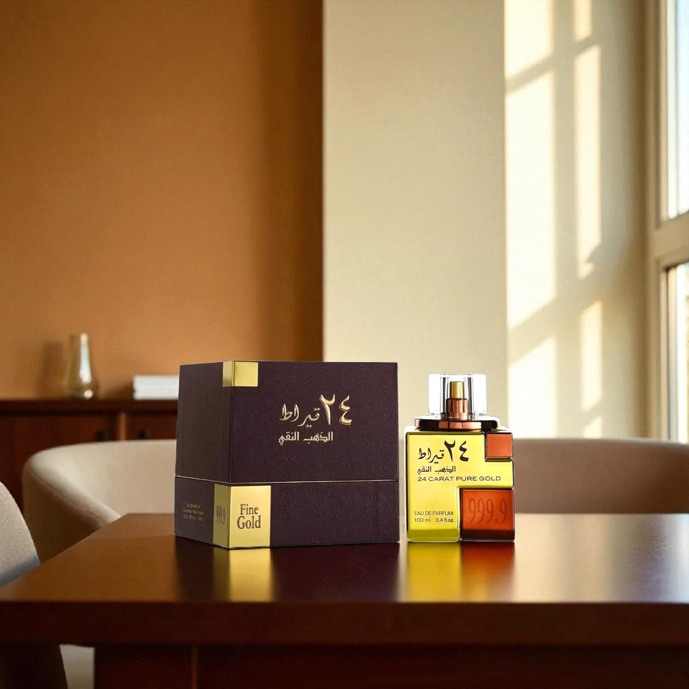 24 Carat Pure Gold Eau de Parfum Lattafa Perfumes, lanzada en 2017, está clasificada como una fragancia unisex y pertenece a las familias olfativas Cuero y Oriental.