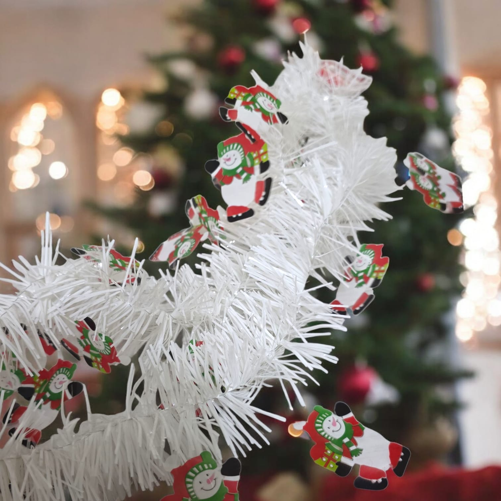 Guirnalda Navideña con Papá Noel Decorativo Dale un toque festivo a tu hogar con esta encantadora guirnalda navideña BLANCA adornada con figuras de MUÑECO NIEVE. Ideal para decorar árboles, ventanas, marcos de puertas o mesas, aporta brillo y alegría a cualquier espacio.