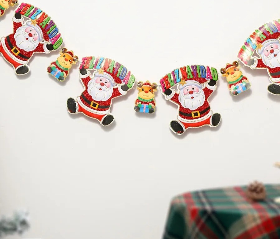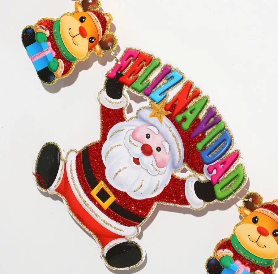Guirnalda Decorativa Navideña con Papá Noel Guirnalda festiva con diseño de Papá Noel y ositos, ideal para decorar el hogar, la oficina o locales comerciales en la época navideña. Fabricada en cartón liviano y resistente, incluye varios personajes impresos en colores brillantes que aportan alegría y espíritu navideño a cualquier ambiente. Fácil de colgar en paredes, ventanas o puertas.