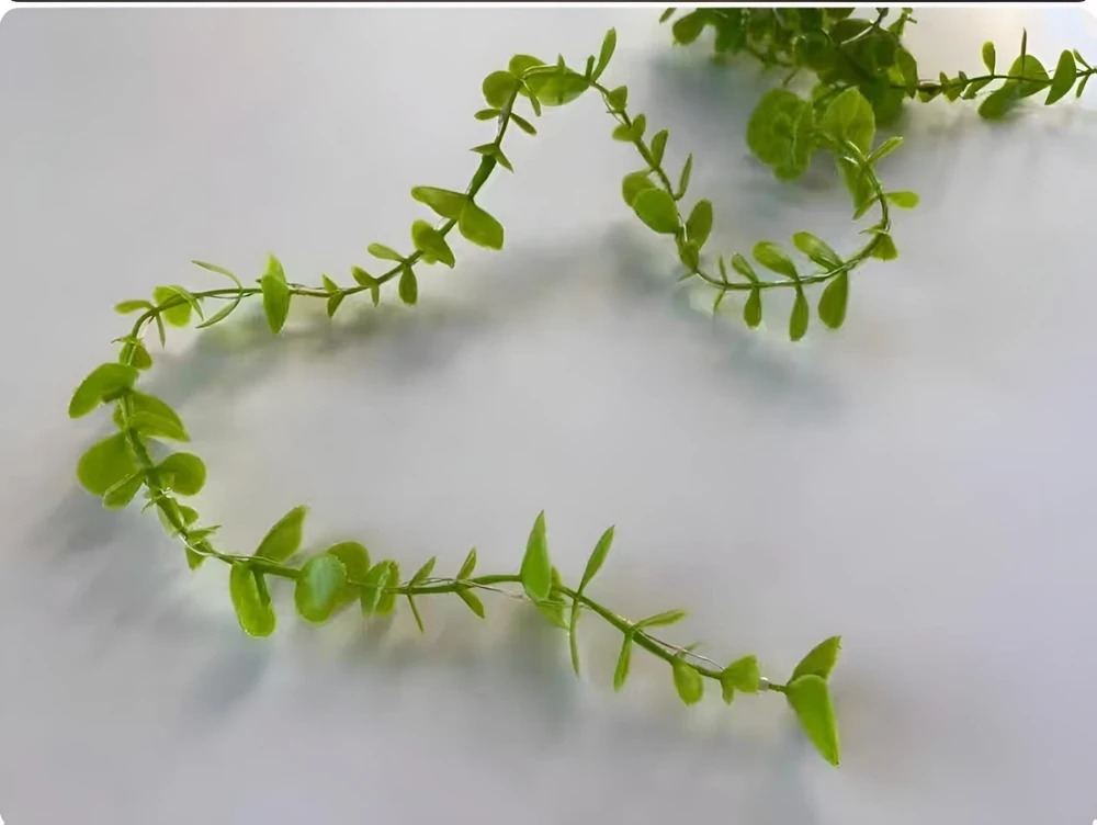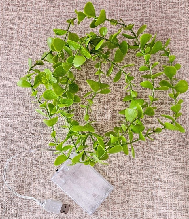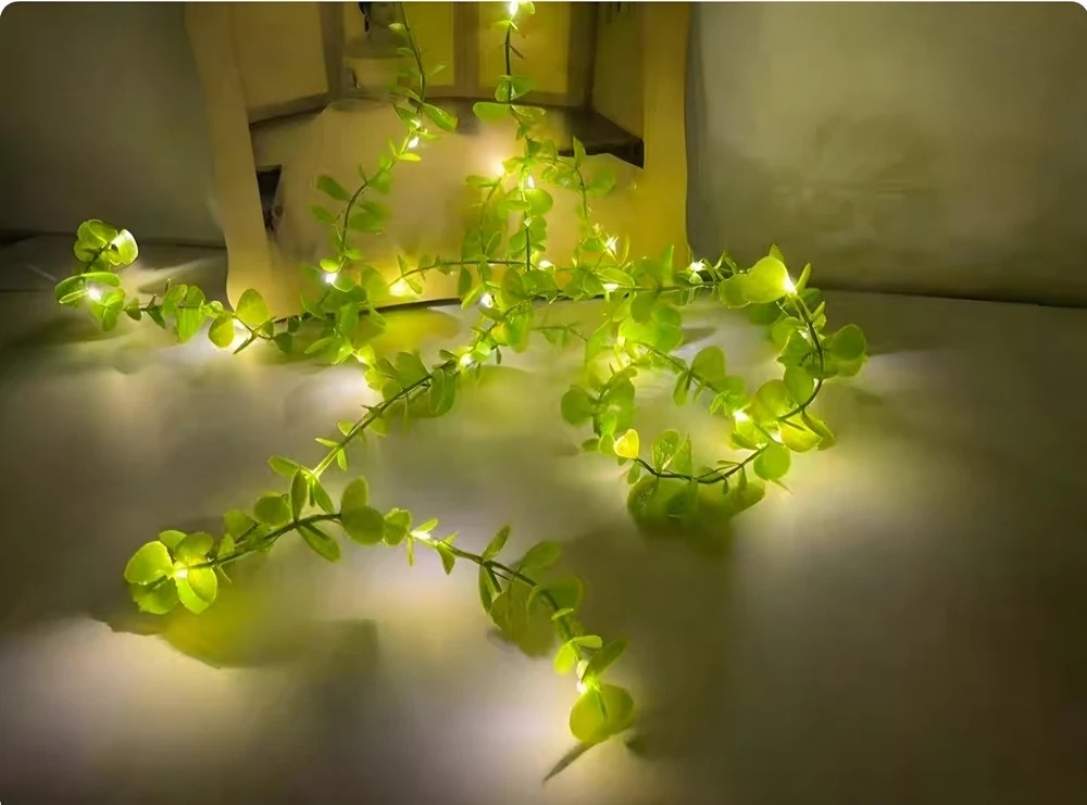 (Guirnalda de luces led con diseño de planta de eucalipto. Cuenta con un cargador a pila y posee una iluminación cálida. Ideal para decorar tu hogar, oficina o comercio).