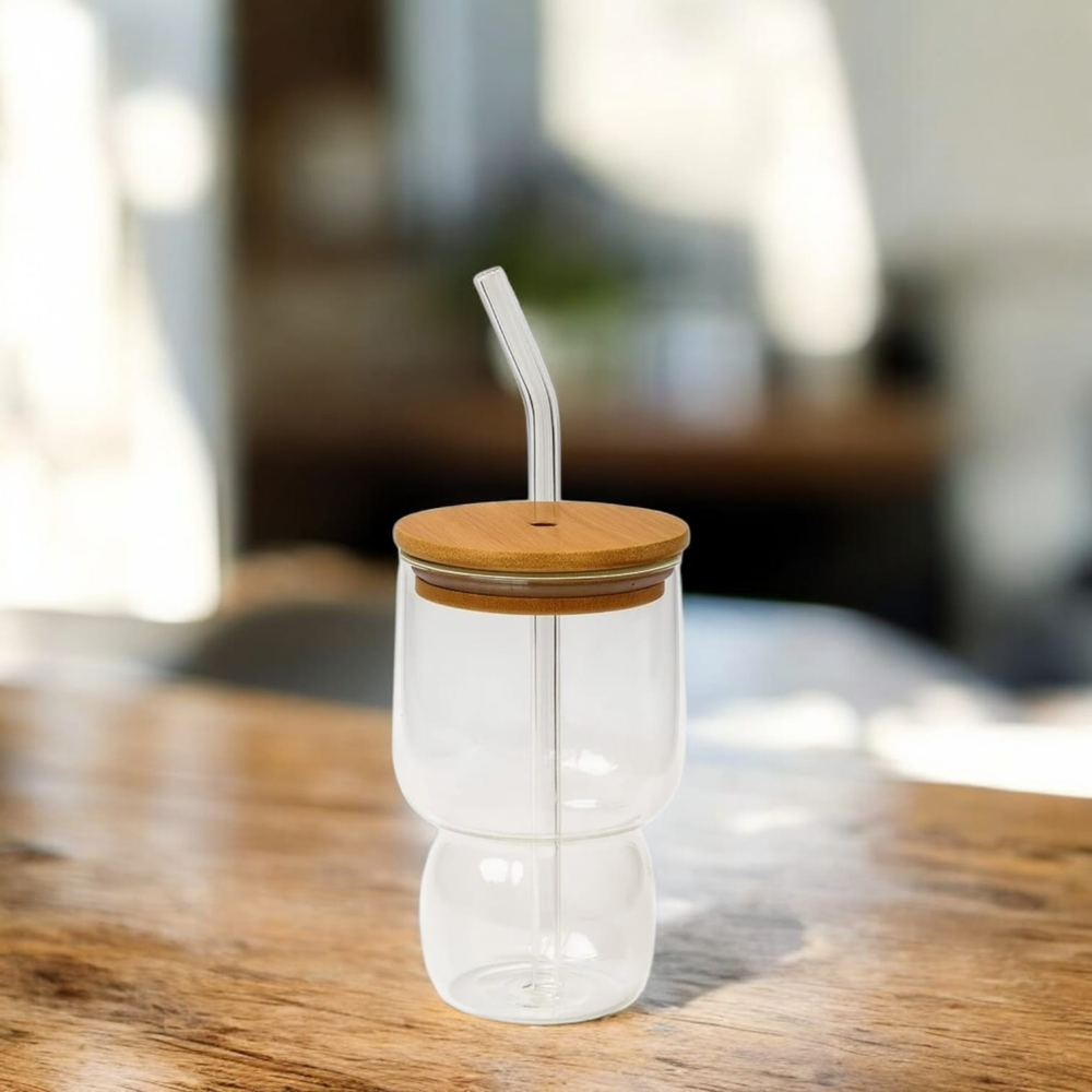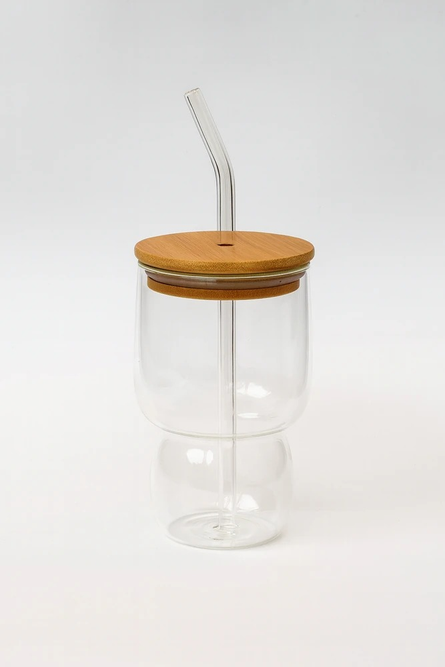 VASO DE VIDRIO CON TAPA BAMBÚ Y BOMBILLA