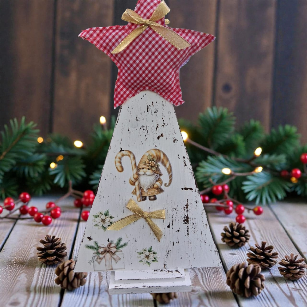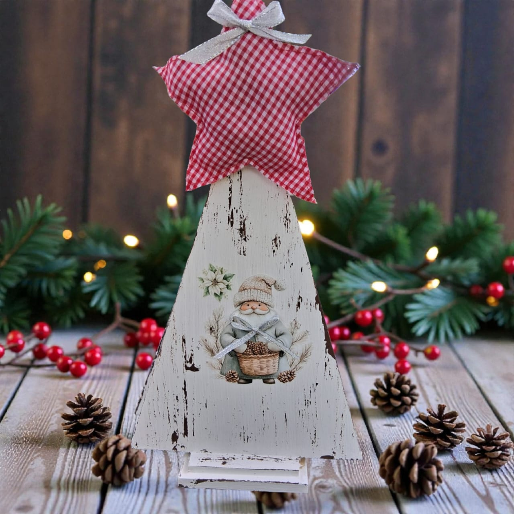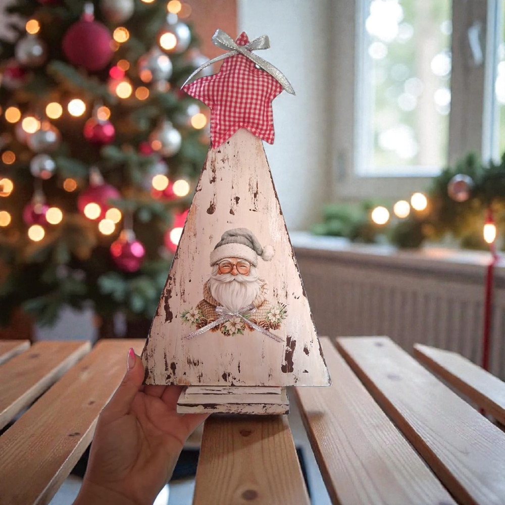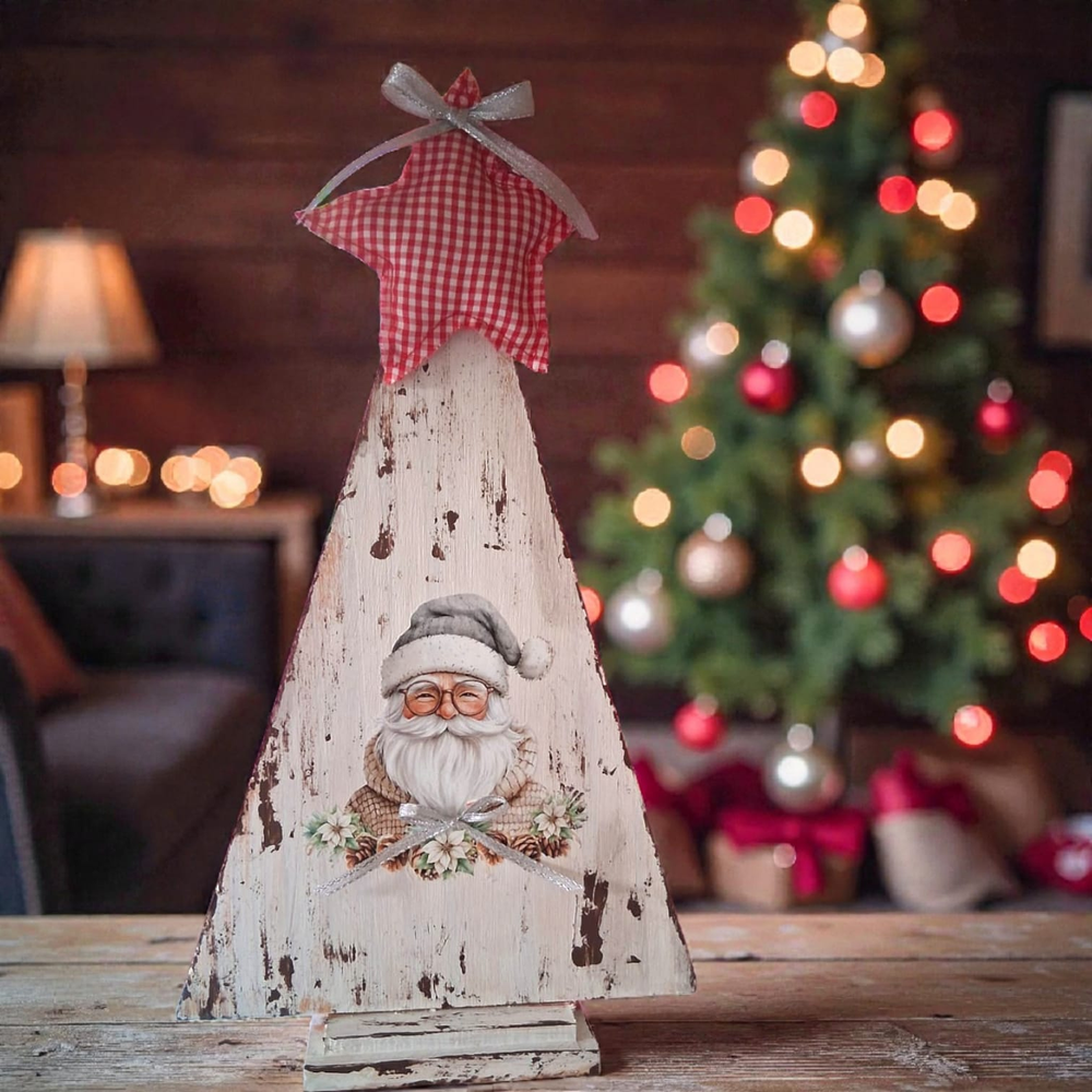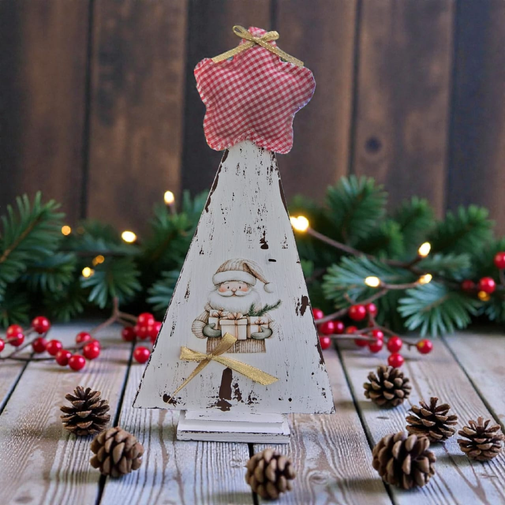 ARBOL MADERA CON PAPA NOEL Y PUNTERA ESTRELLA TELA