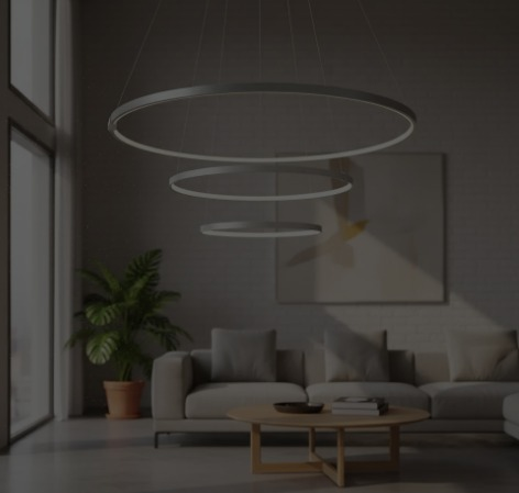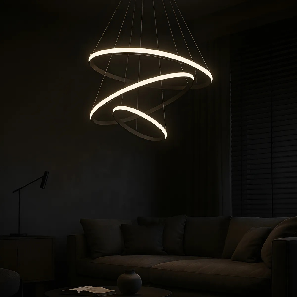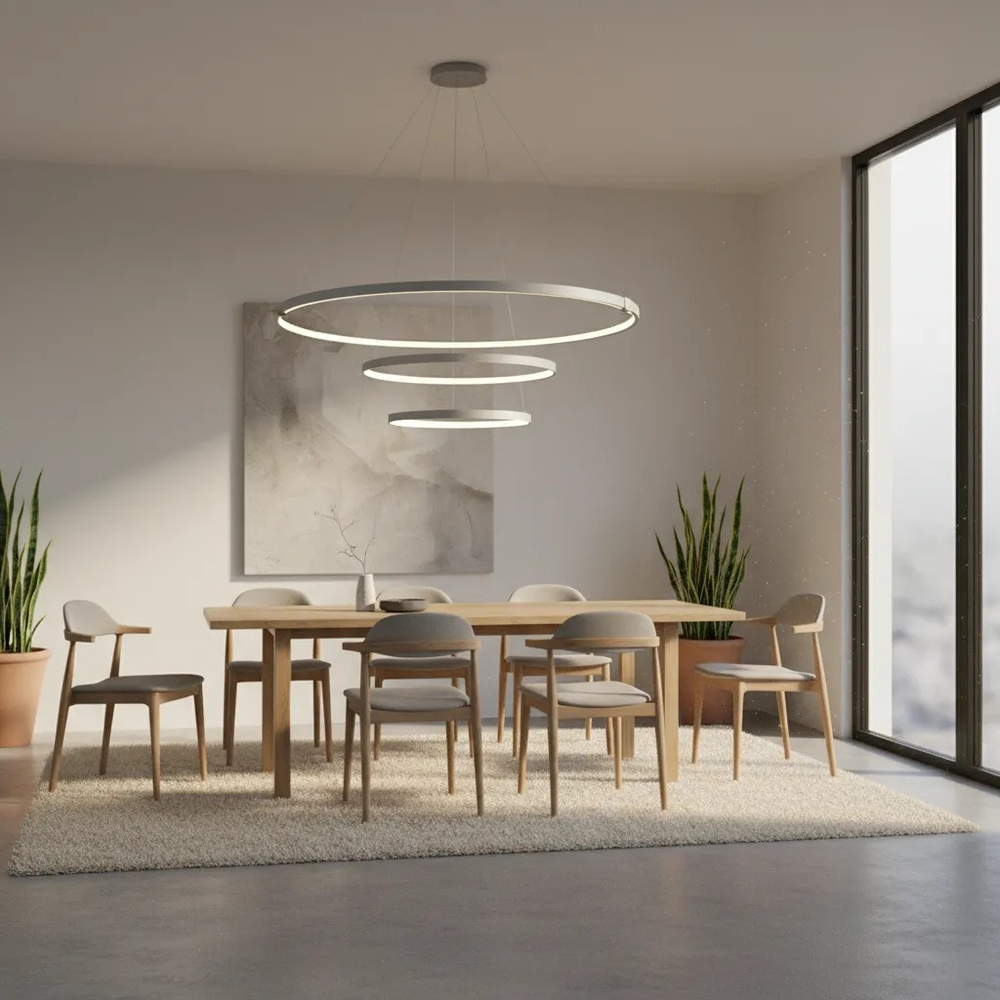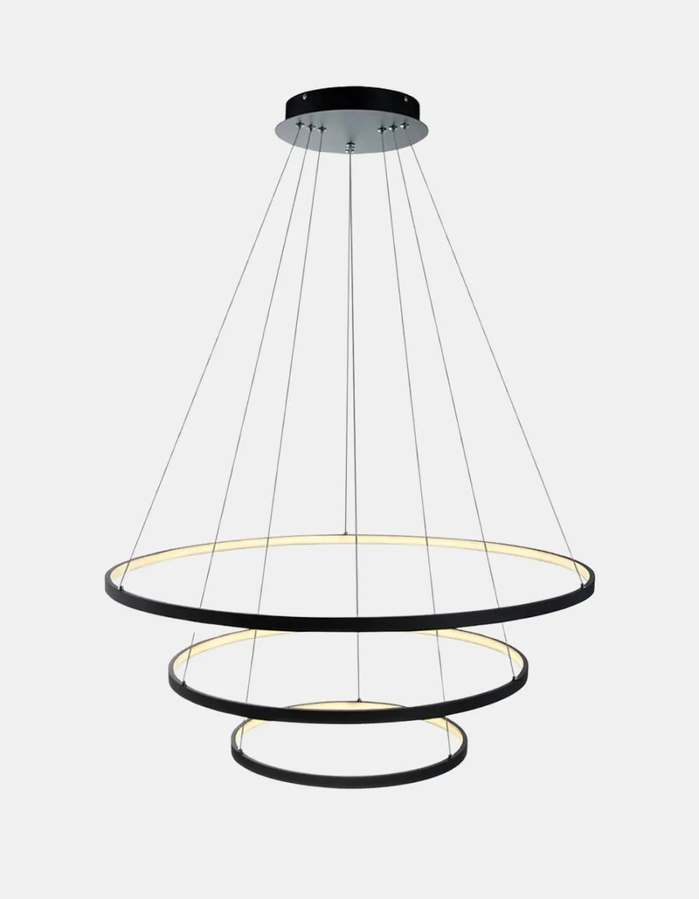 Colgante LED de diseño moderno con 3 aros circulares. Ideal para livings, comedores o espacios amplios.