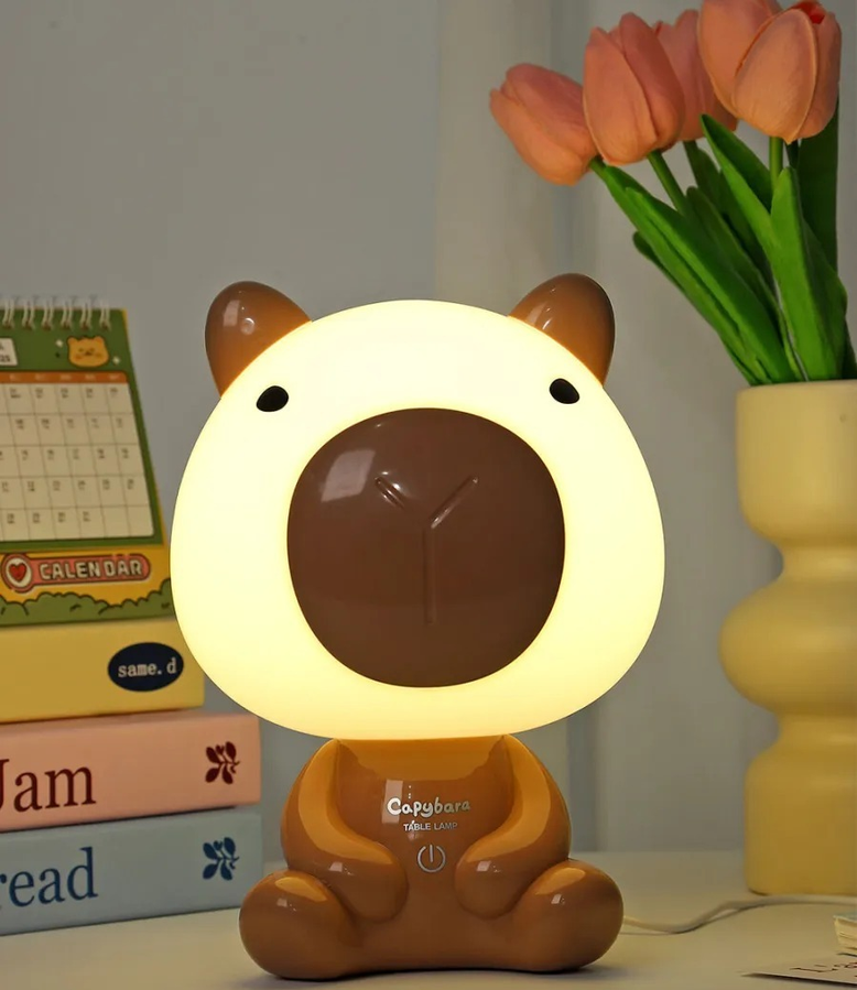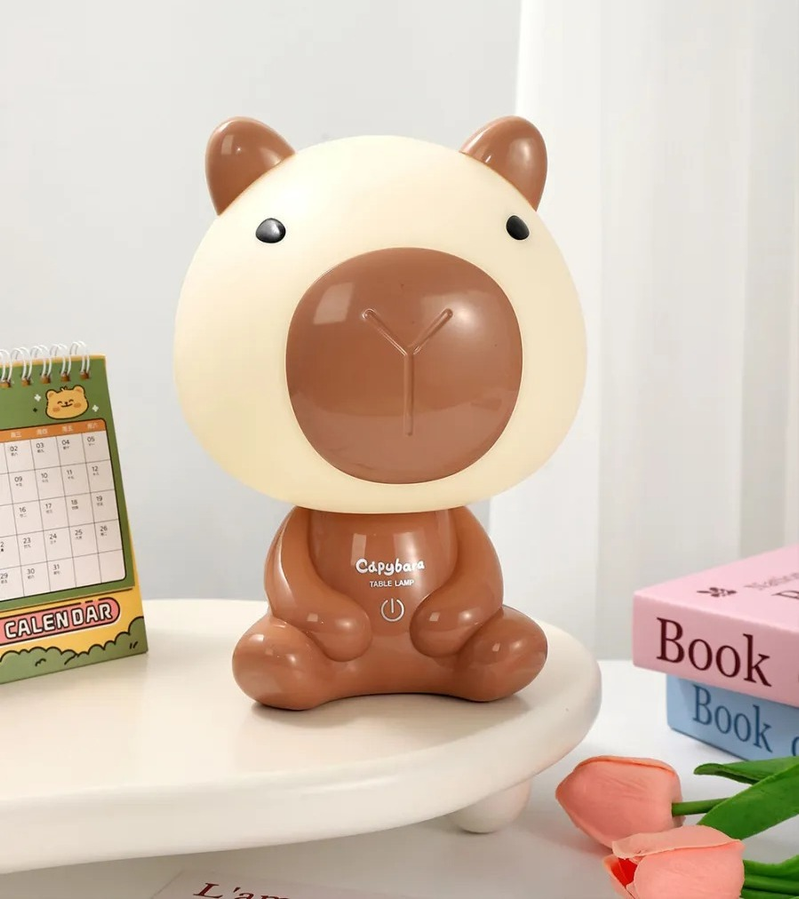 Velador LED con diseño de Capibara. La luz es suave y cálida, ideal para acompañarte mientras leés o trabajás. Se carga por USB.