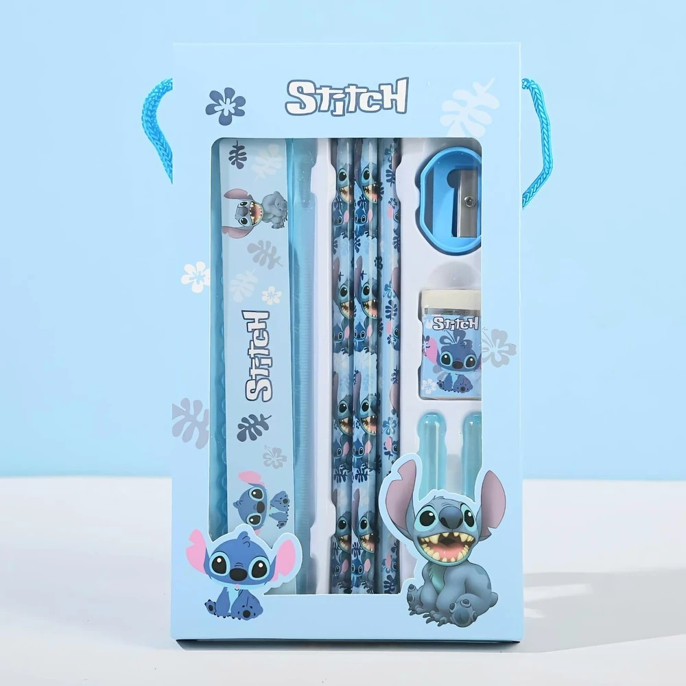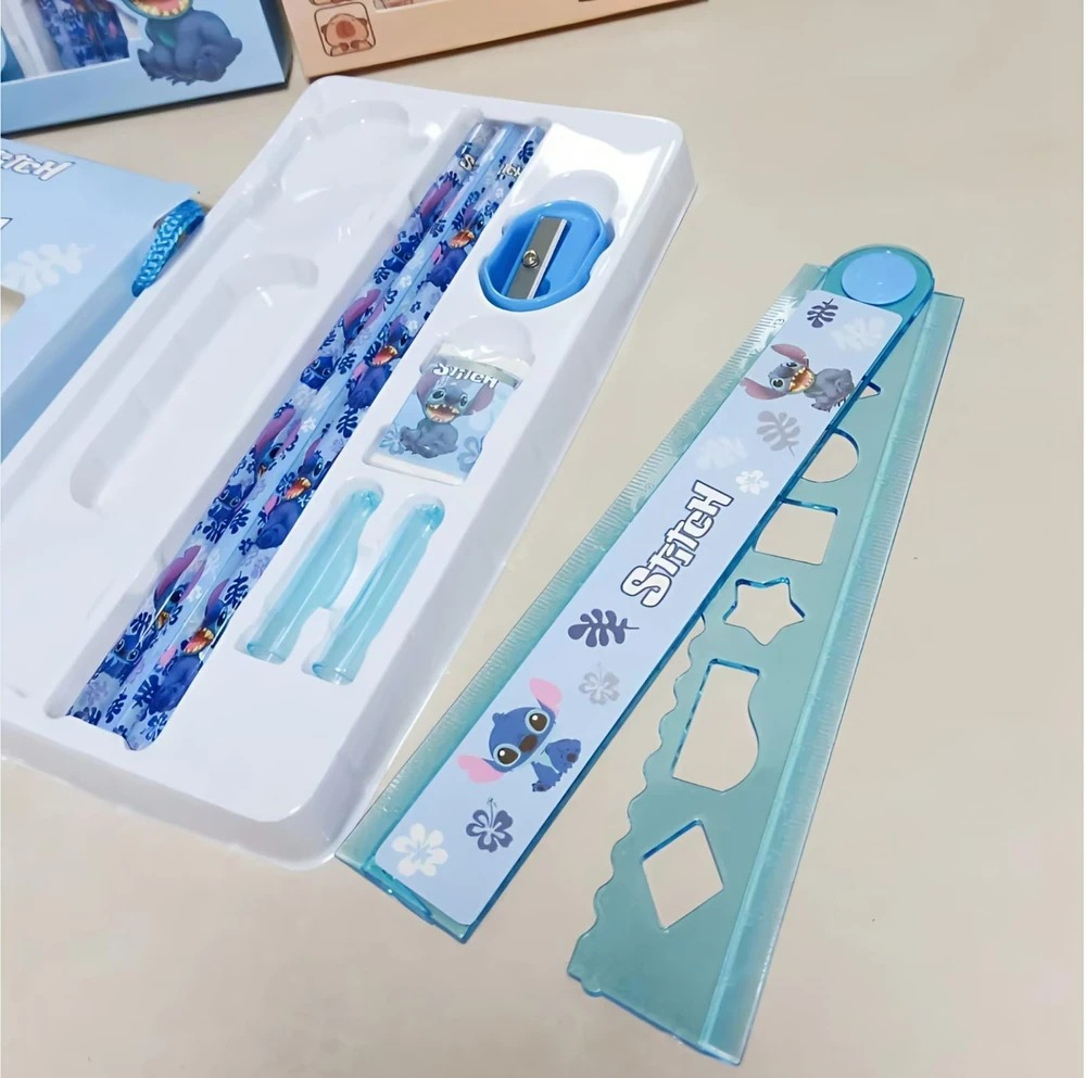 (Cuenta con 3 lápices, un sacapuntas, un borrado y dos reglas, una de ellas con formas. Este set viene presentado en una caja todo con diseños de stitch. Ideal para el inicio de clases).