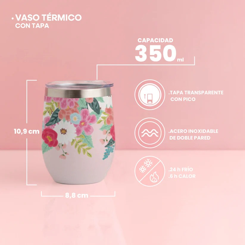 Práctico y cómodo para usar todos los días, este vaso térmico de 350 ml cuenta con acero inoxidable de doble pared, ideal para mantener tus bebidas frías o calientes por más tiempo. Incluye tapa transparente con pico, perfecta para llevarlo en la mano, en el auto o en la oficina sin preocuparte por derrames.