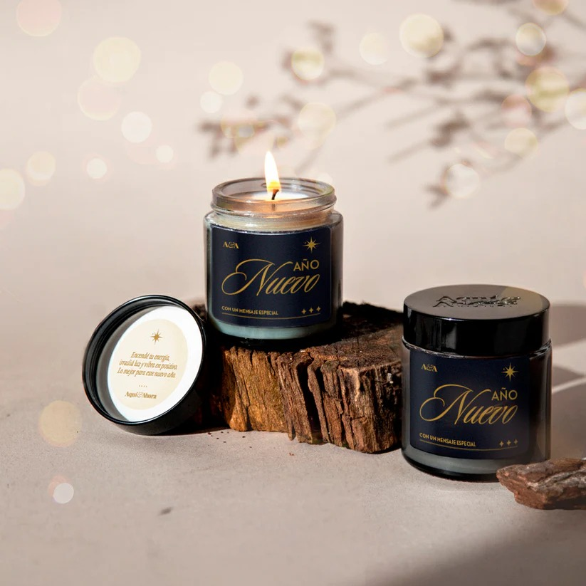 Nuestras Velas Petite Grey Edición Año Nuevo llegan en un frasco de vidrio gris con tapa negra y mensaje especial para recibir lo que viene con intención y buena energía.
