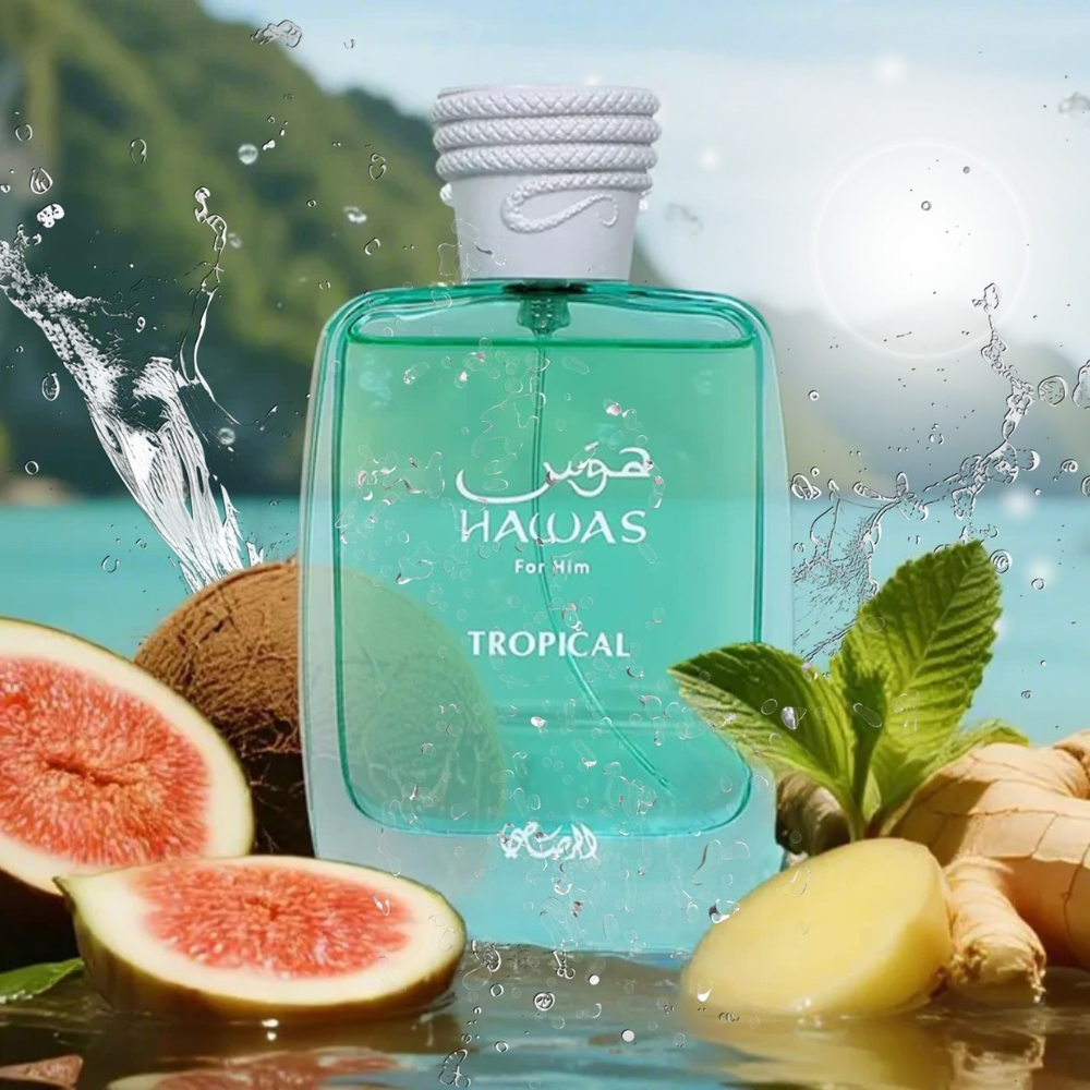 Hawas Tropical de Rasasi es una fragancia de la familia olfativa Aromática Verde para Hombres. Esta fragancia es nueva, se lanzó en 2025. Las Notas de Salida son Agua de coco, jengibre, hojas de higuera; las Notas de Corazón son coco, higo, menta; las Notas de Fondo son sándalo, haba tonka y almizcle. Hawas Tropical irrumpe como un manto de frescura viril, donde el agua de coco se mezcla con el picante vibrante del jengibre para un inicio poderoso y exótico. Las hojas de higuera aportan un matiz verde intenso que contrasta con la suavidad cremosa del coco y la dulzura madura del higo. La menta despierta un frescor cortante que potencia la energía masculina de la composición. En el corazón, el sándalo despliega su calidez amaderada, construyendo una base sólida y elegante. La haba tonka introduce un toque ambarado y seductor que refuerza la profundidad de su carácter. El almizcle corona la mezcla con un halo limpio y persistente que prolonga su magnetismo. Así, Hawas Tropical se convierte en la expresión de una masculinidad aventurera, fresca y audaz, inspirada en paisajes tropicales de fuerza y libertad!!