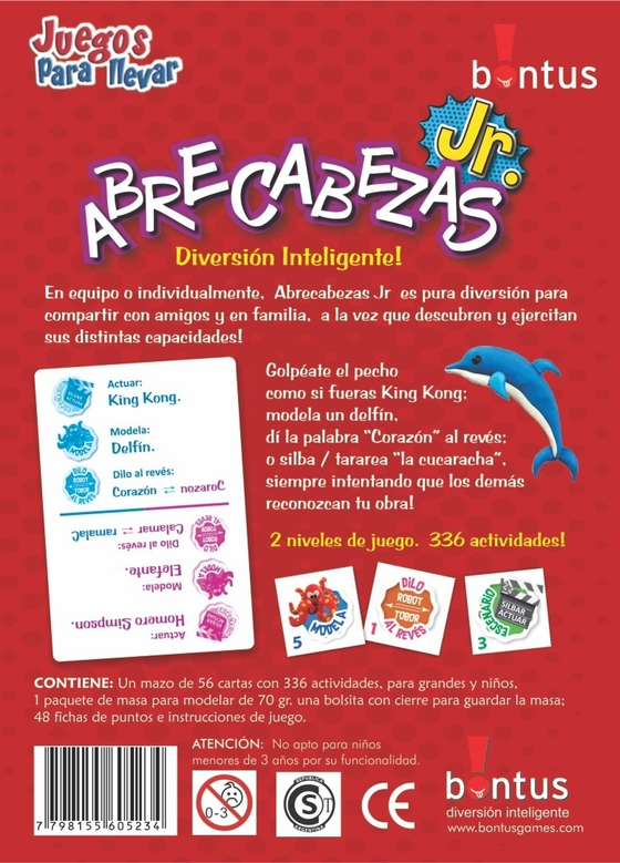 En equipo o individualmente, Abrecabezas Jr. es pura diversión para compartir con amigos y en familia, a la vez que descubren y ejercitan sus distintas capacidades! Golpéate el pecho como si fueras King Kong; modela un delfín, dí la palabra "Corazón" al revés; o silba/ tararea "la cucaracha", siempre intentando que los demás reconozcan tu obra! 2 niveles de juego. 336 actividades!