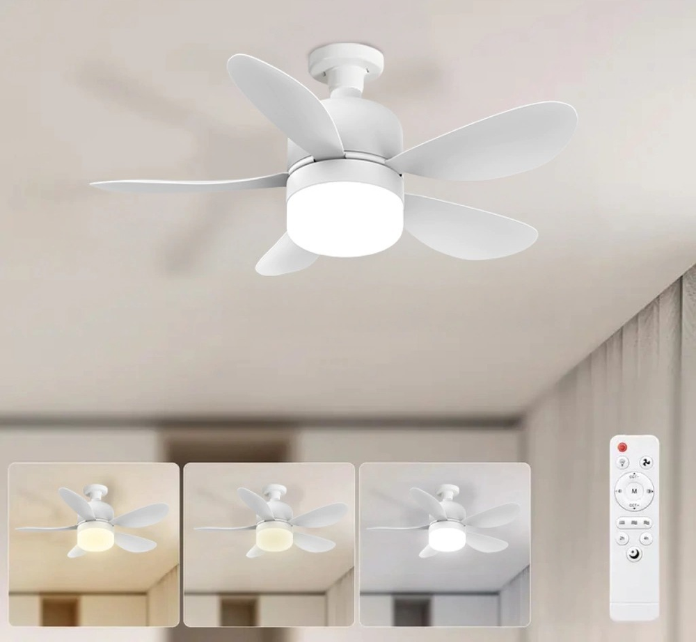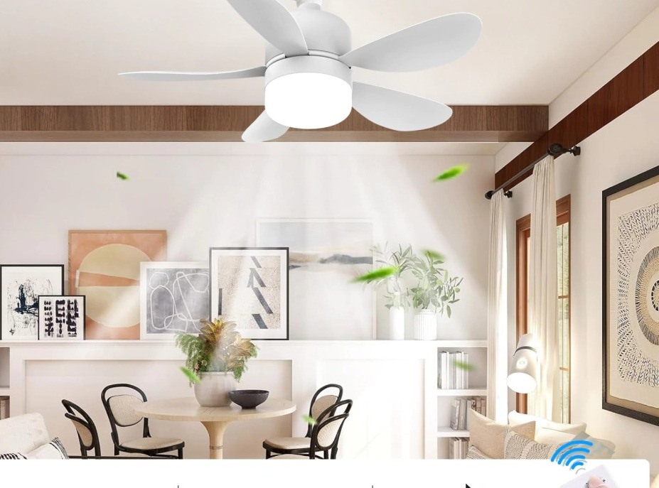 Ventilador de techo moderno con iluminación integrada, ideal para dormitorios, livings y espacios medianos. Ofrece ventilación eficiente y luz regulable para crear un ambiente perfecto.